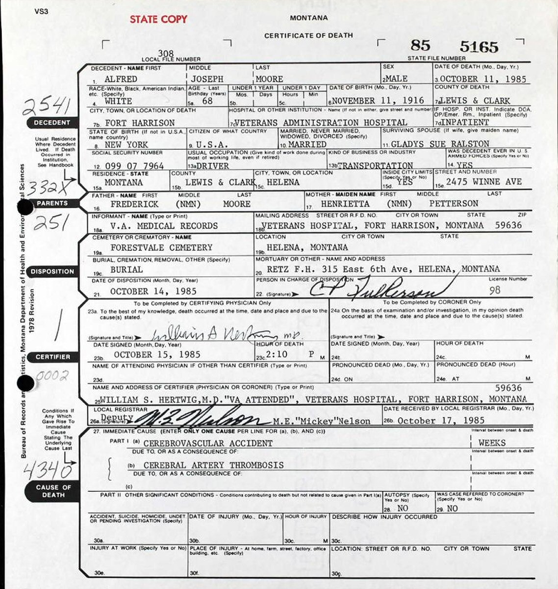 Died: October 11, 1985 in Veterans Administration Hospital, Fort Harrison, Lewis and Clark County, Montana.
