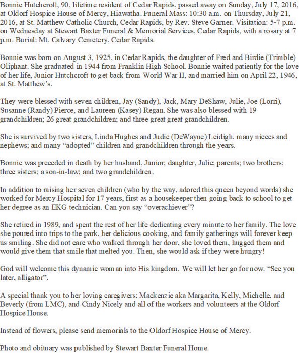 Died: July 17, 2016 in Hiawatha, Linn County, Iowa.