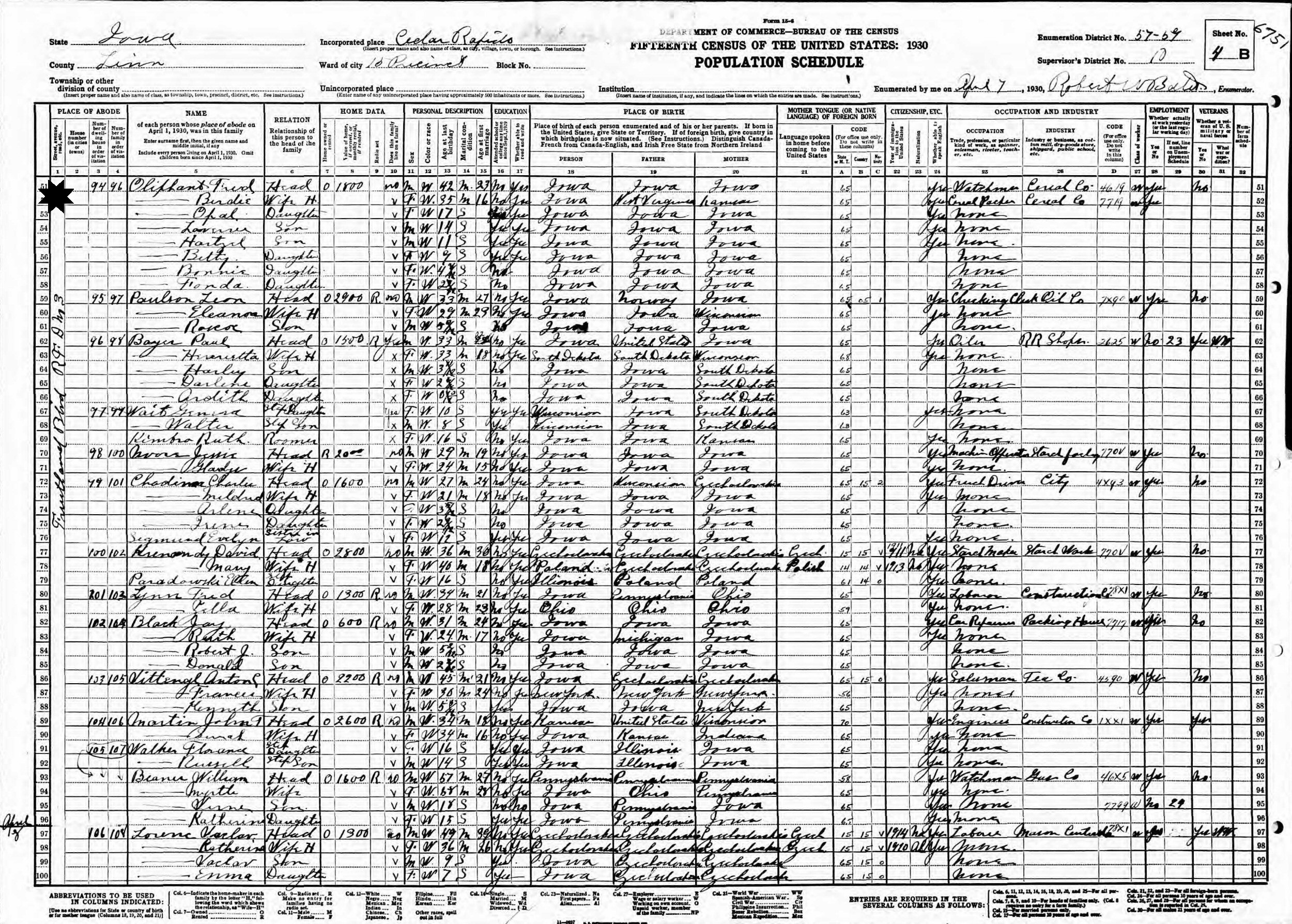 April 7, 1930 - Fourth and Blvd R.F.D. M3, Precinct 10, Supervisor's District 10, Enumeration District 57-59, Cedar Rapids, Linn County, Iowa.