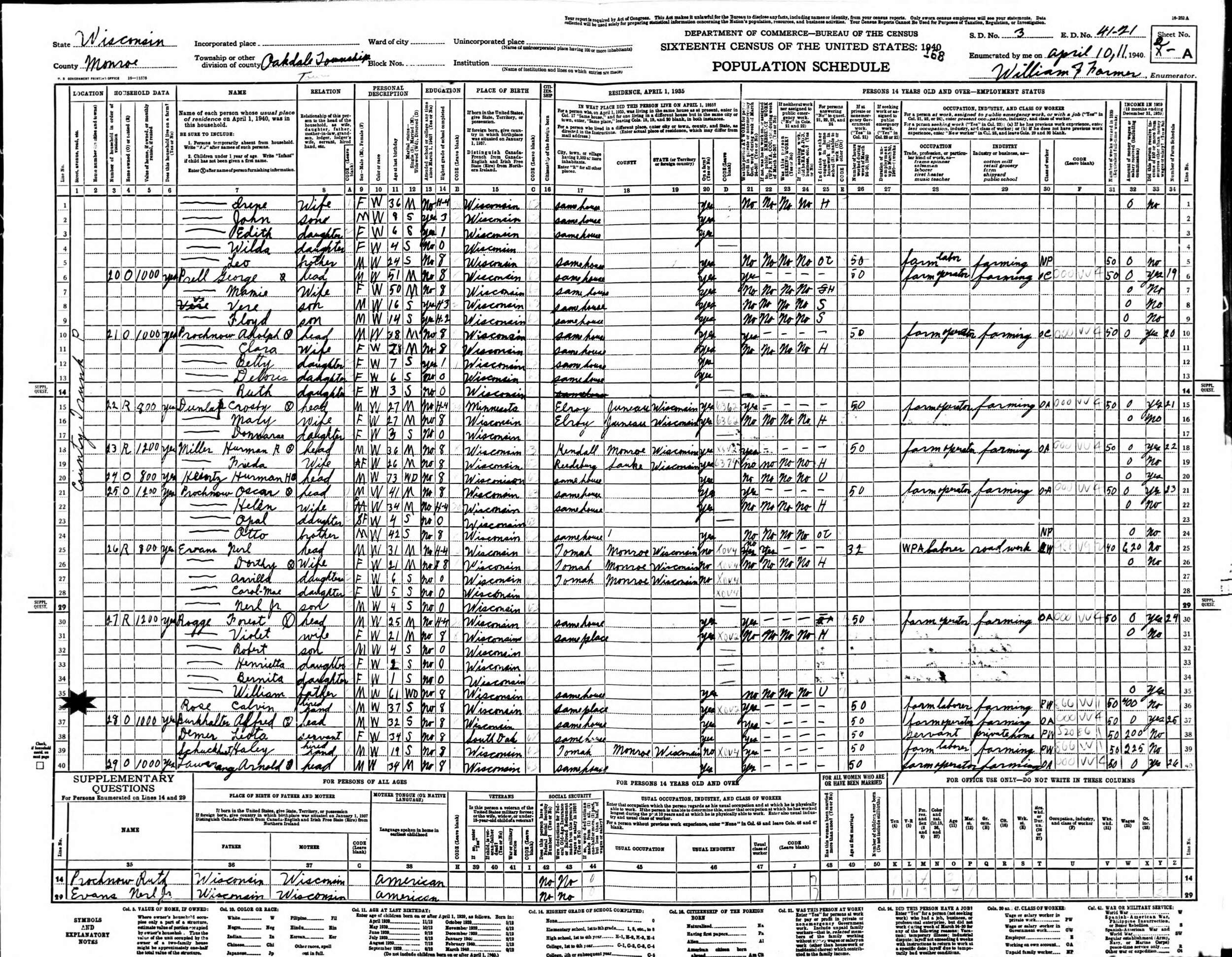 April 10-11, 1940 - County Trunk P, Supervisor's District 3, Enumeration District 41-21, Oakdale Township, Monroe County, Wisconsin.