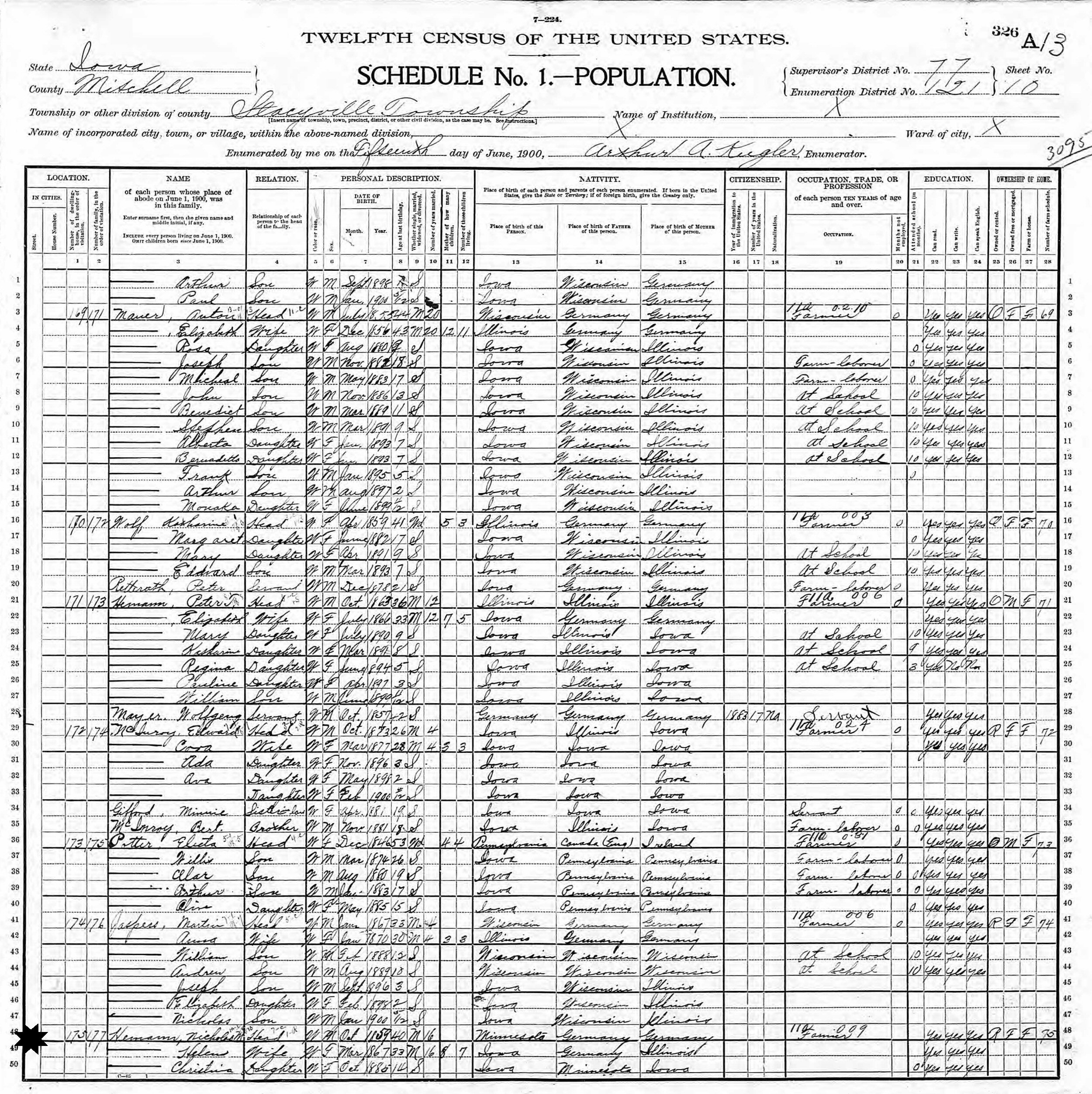 June 15, 1900 - Supervisor's District 77, Enumeration District 121, Stacyville Township, Mitchell County, Iowa.