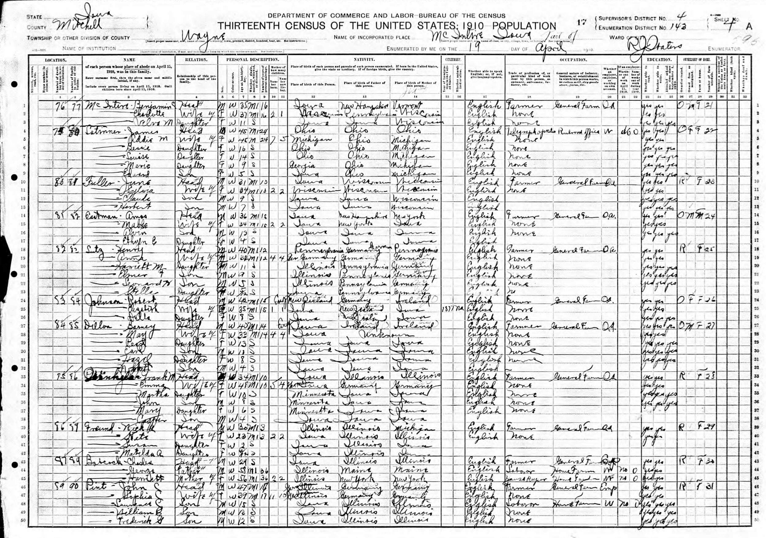 April 19, 1910 - Supervisor's District 4, Enumeration District 143, Wayne, McIntire, Mitchell County, Iowa.
