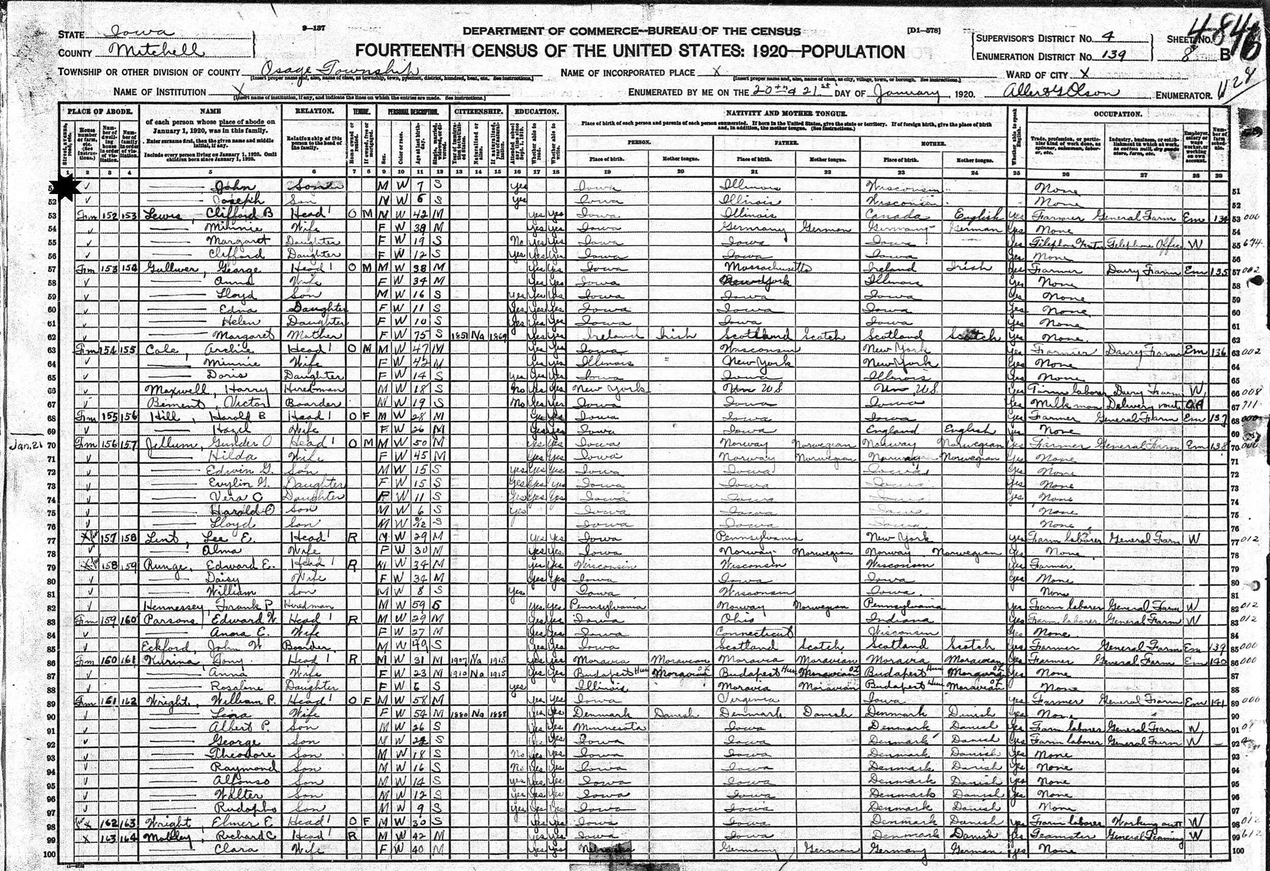January 19-20, 1920 - Farm, Supervisor's District 4, Enumeration District 139, Osage Township, Mitchell County, Iowa.