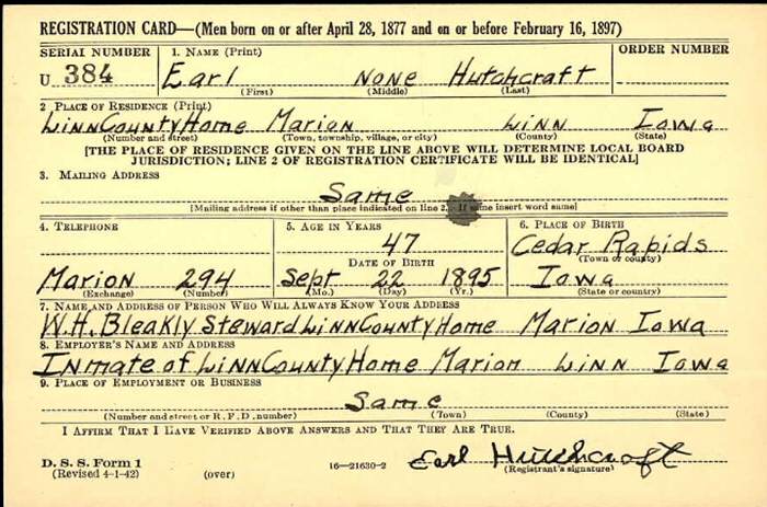 June 5, 1917 - Inmate of County Home, Marion, Linn County, Iowa.