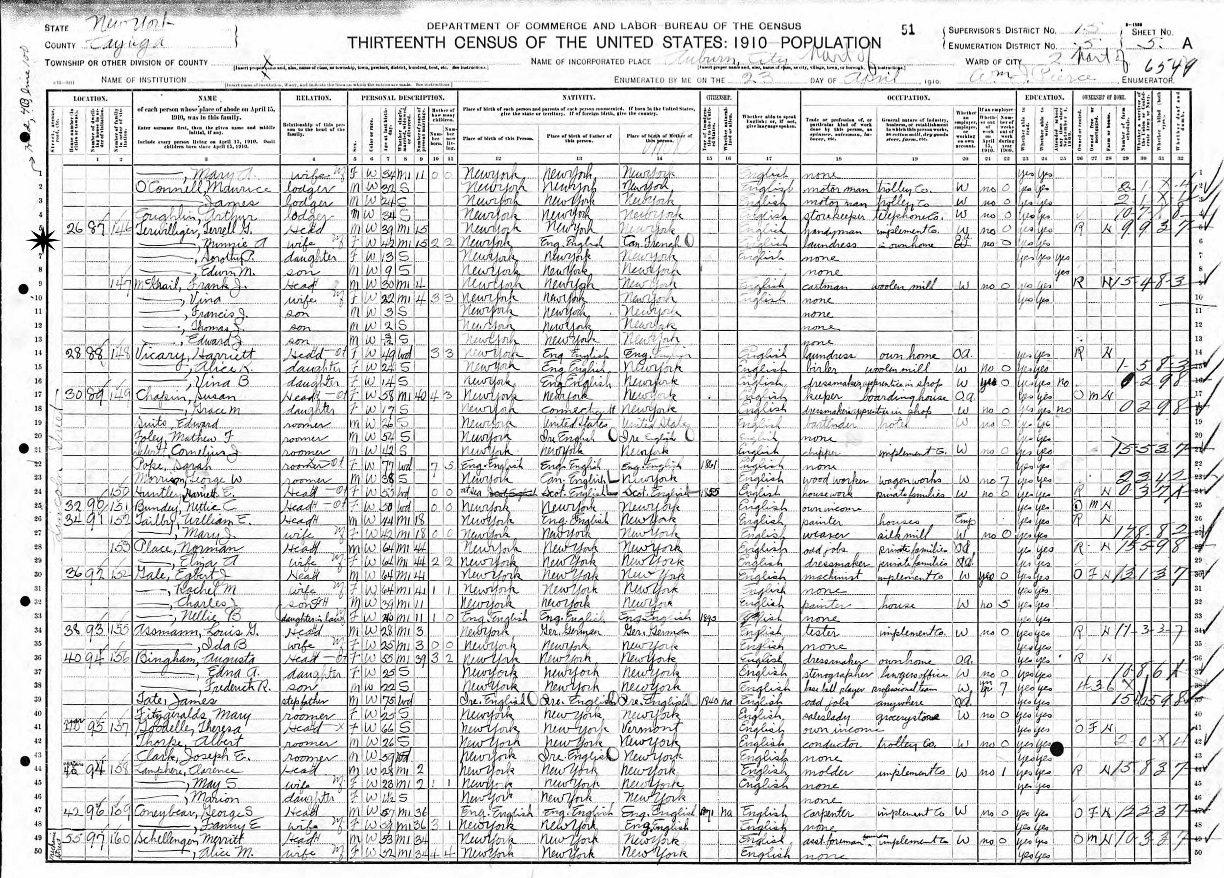 April 23, 1910 - 26 Lincoln Street, Ward 2, Supervisor's District 15 Enumeration District 5, Auburn, Cayuga County, New York.