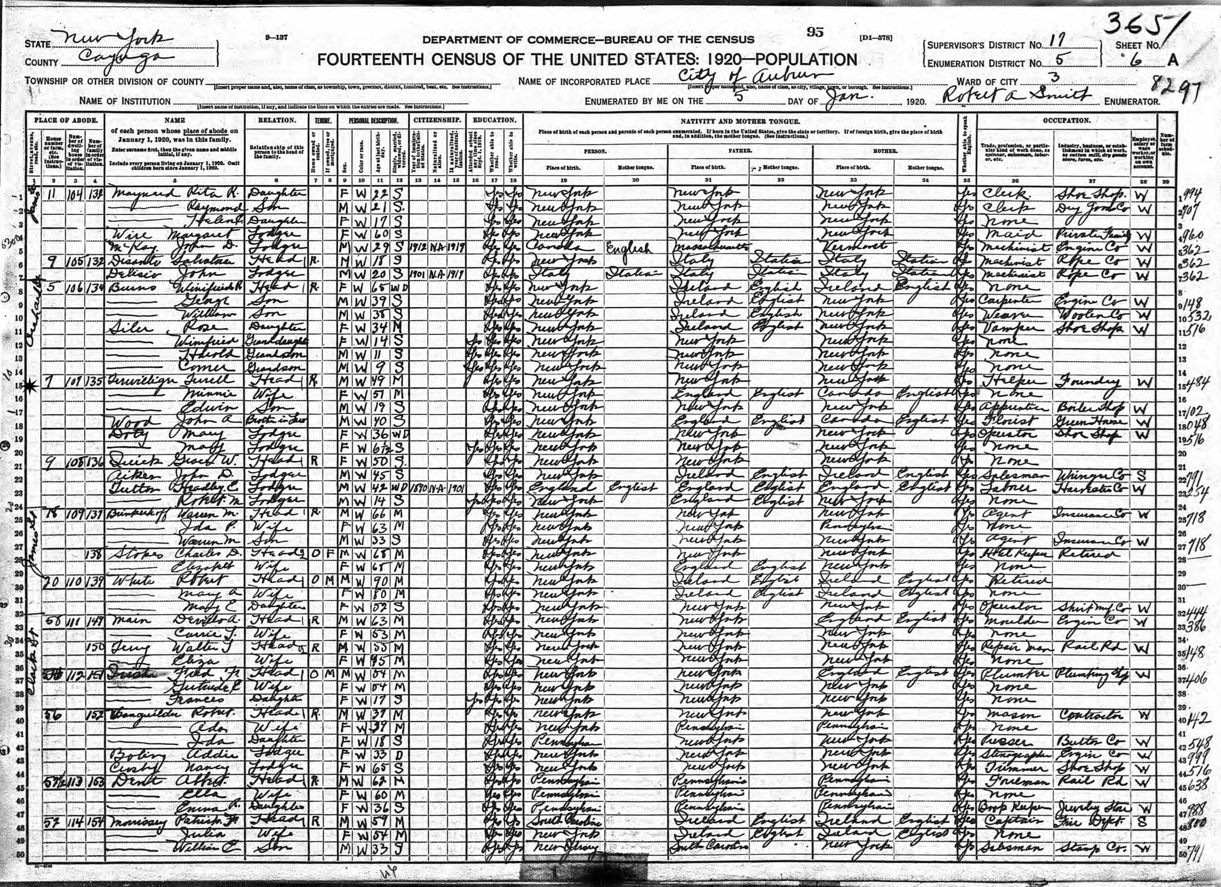 January 5, 1920 - 7 Orchard Street, Ward 3, Supervisor's District 17, Enumeration District 5, Auburn, Cayuga County, New York.
