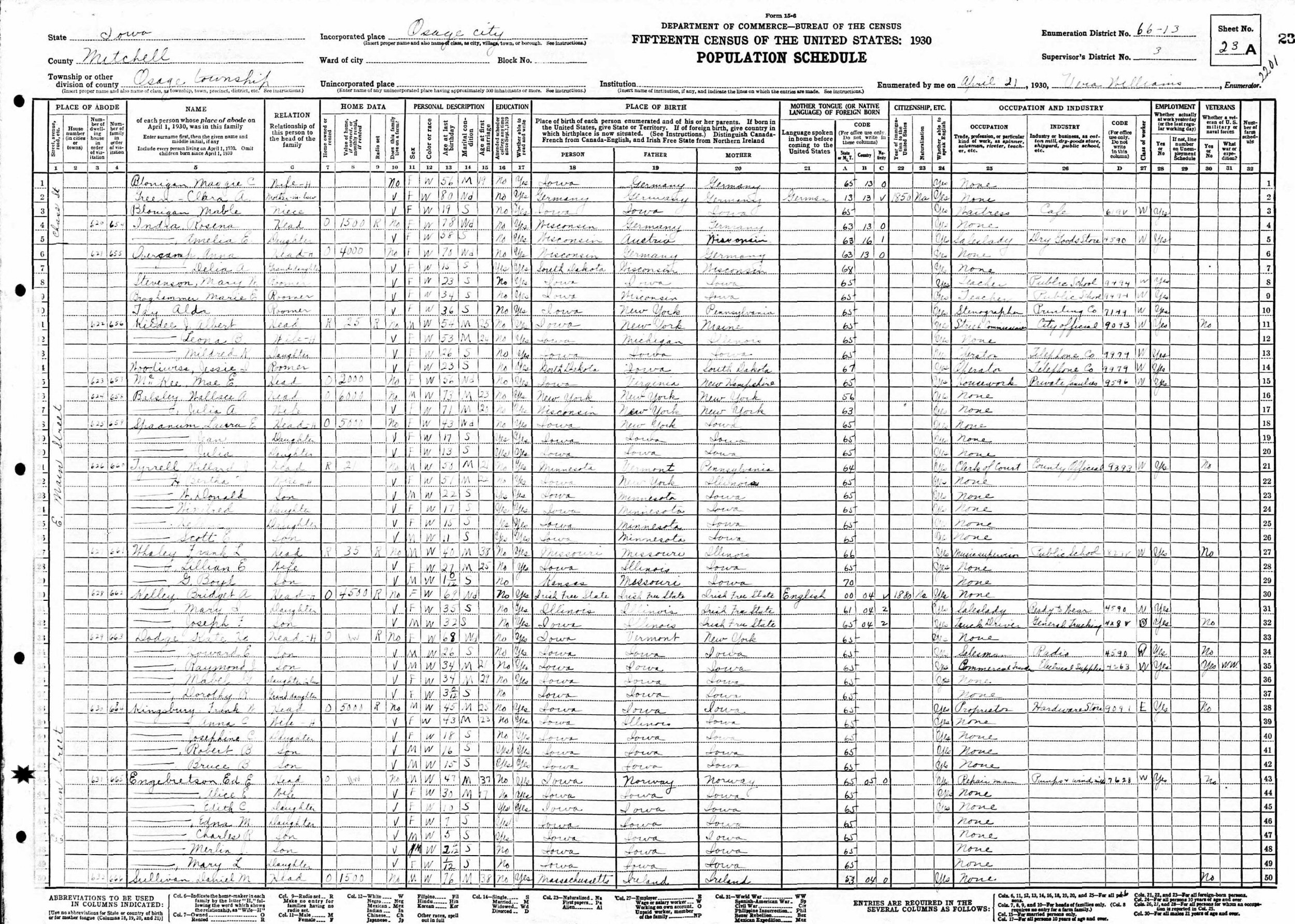 April 21, 1930 - East Main Street, Supervisor's District 3, Enumeration District 66-13, Osage Township, Mitchell County, Iowa.