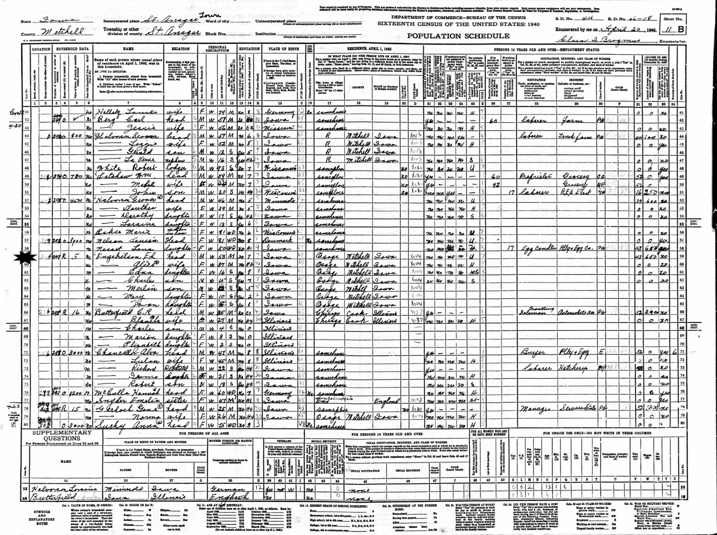 April 20, 1940 - Supervisor's District 4, Enumeration District 66-18, St. Ansgar Township, St. Ansgar, Mitchell County, Iowa.