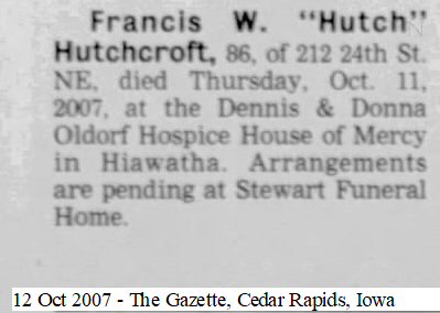 Died: October 11, 2007 in Dennis & Donna Oldorf Hospice House of Mercy, Hiawatha, Linn County, Iowa.