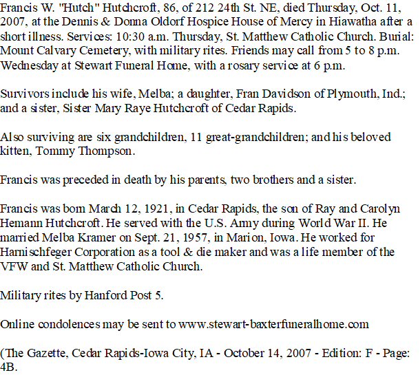 Notes for FRANCIS WILLIAM "WILLIAM" HUTCHCROFT: