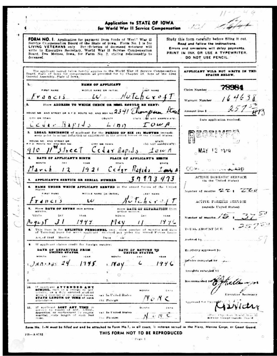 May 7, 1949 - Application for WWII Service Compensation.