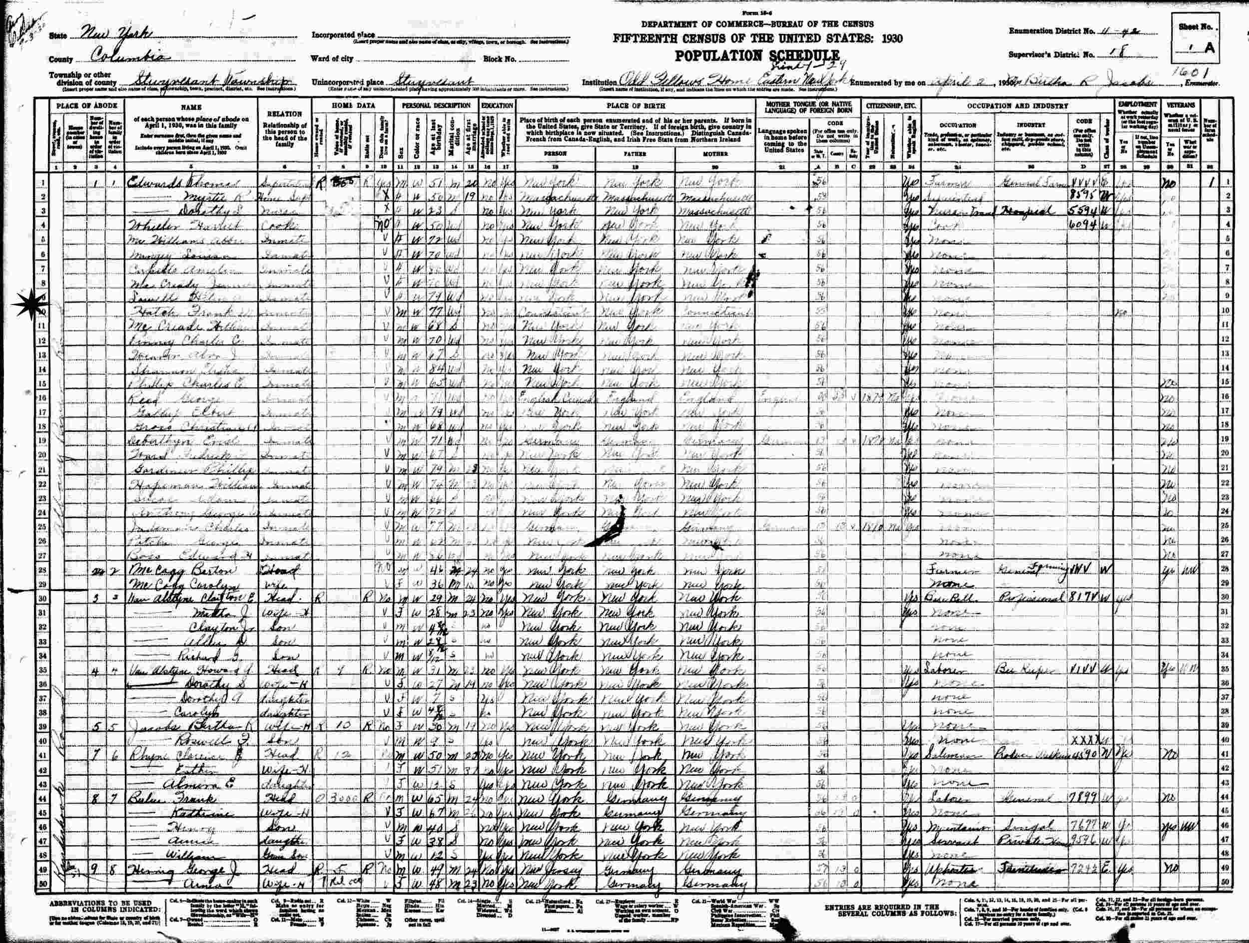 April 2, 1930 - Odd Fellows Home of Eastern New York, Albany River Road, Supervisor's District 18, Enumeration District 11-42, Stuyvesant, Columbia County, New York.