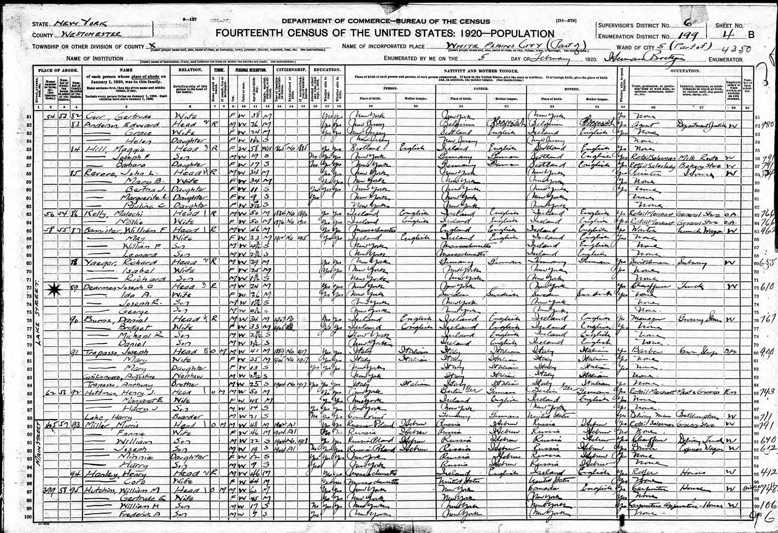 February 5, 1920 - 58 Lake Street, Ward 5, Supervisor's District 6, Enumeration District 199, White Plains, Westchester County, New York.