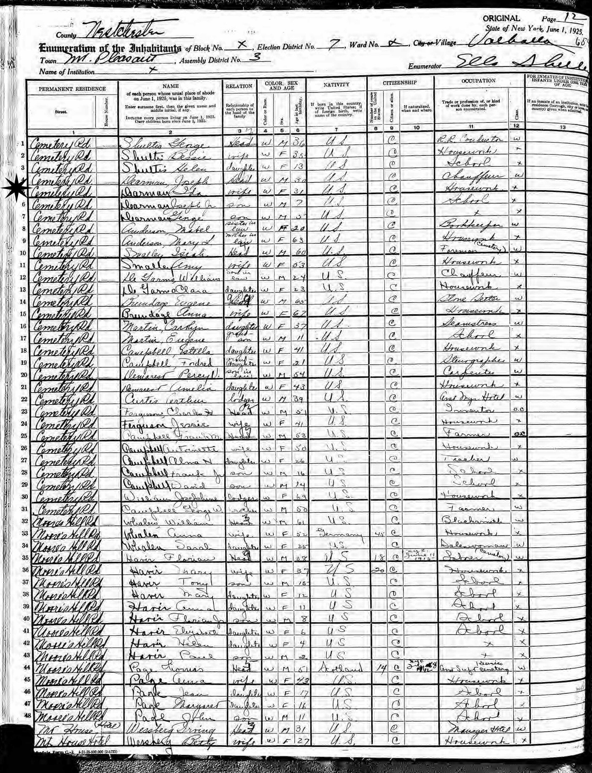 June 1, 1925 - Cemetery Road, Election District 7, Assembly District 3, Valhalla, Mt. Pleasant, Westchester County, New York.