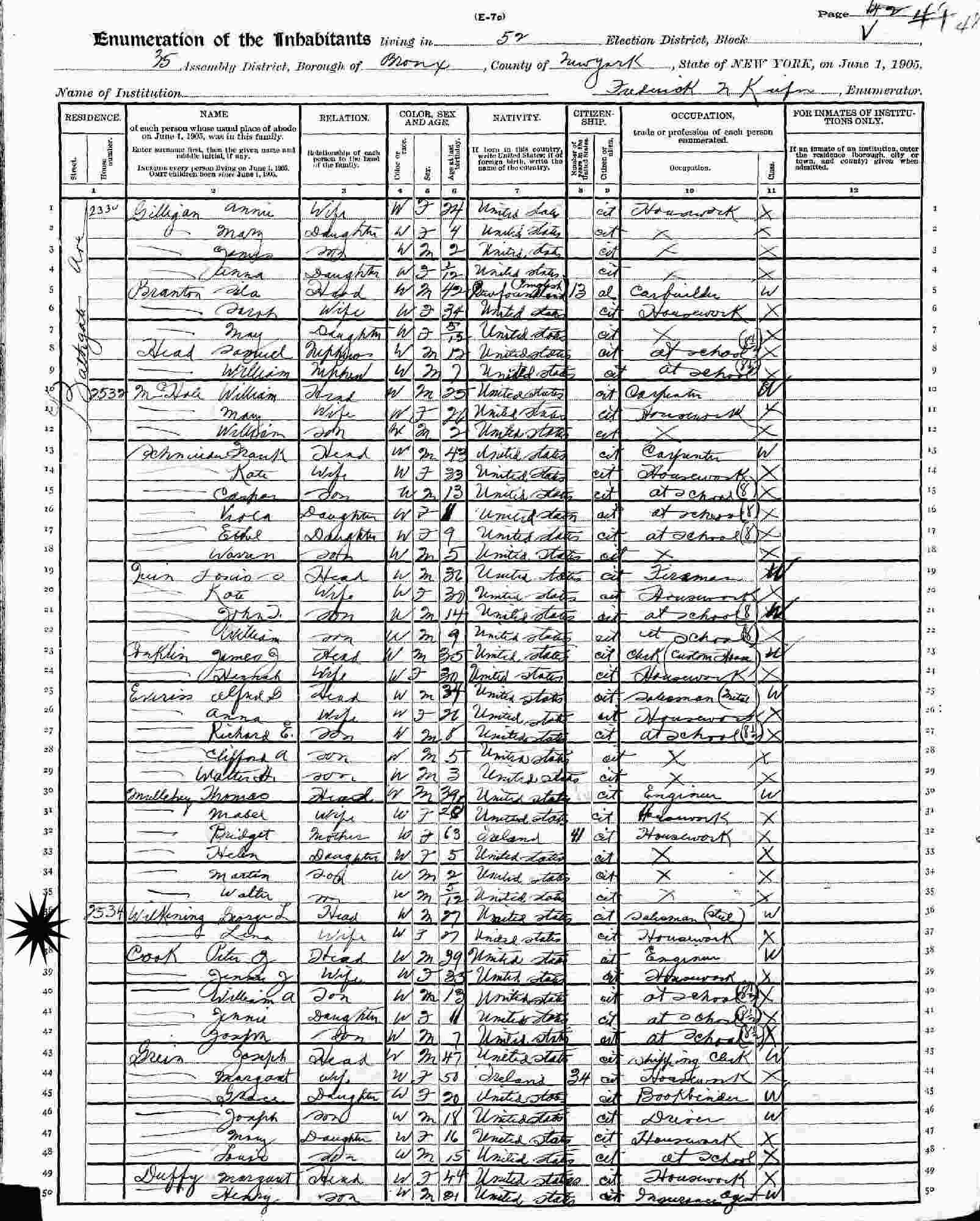 June 1, 1905 - New York State - 2534 Bathgate Avenue, Assembly District 35, Election District 52, Bronx, New York, New York.