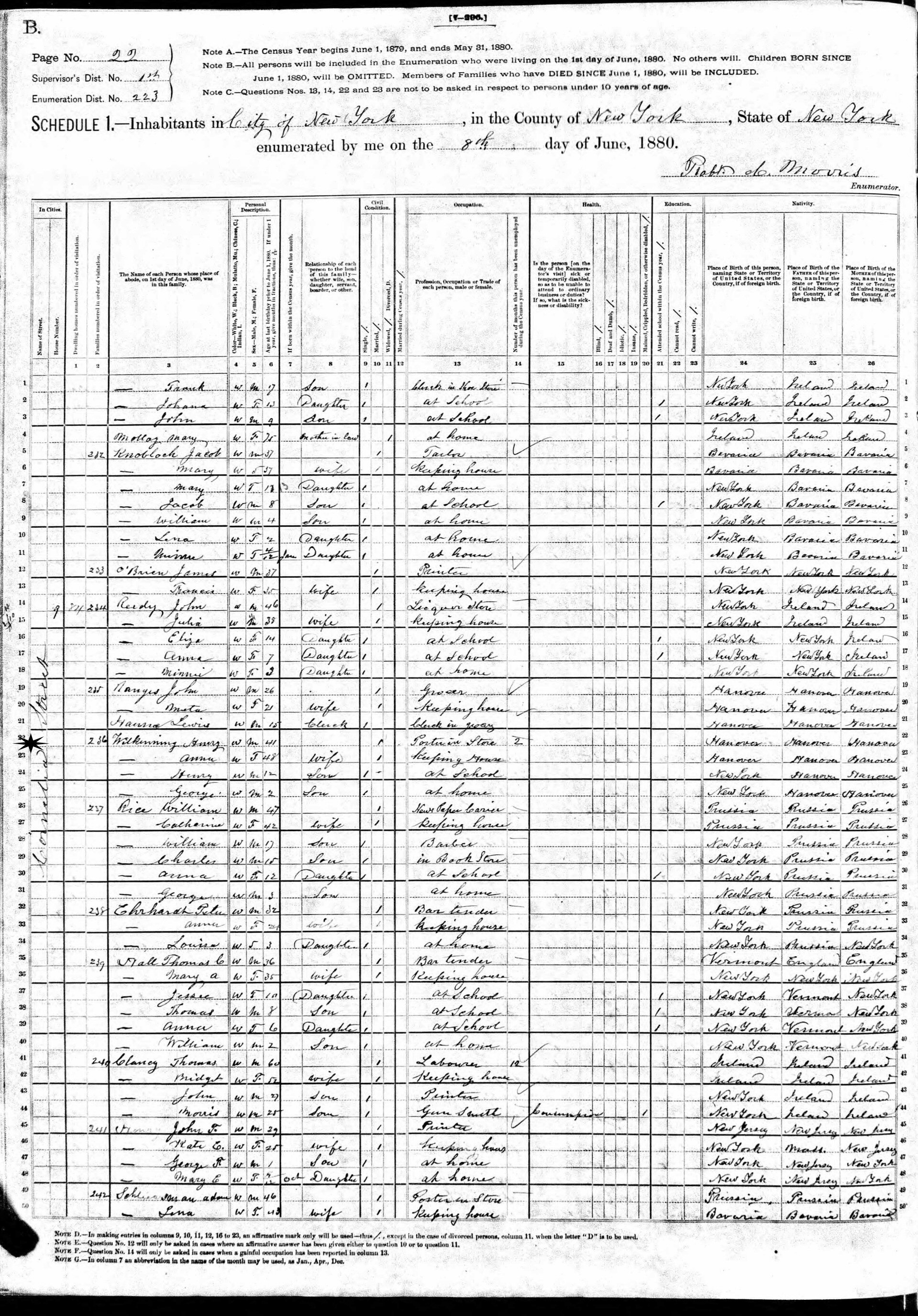 June 6, 1880 - 721 Cornelia Street, Supervisor's District 1, Enumeration District 223, New York City, New York.