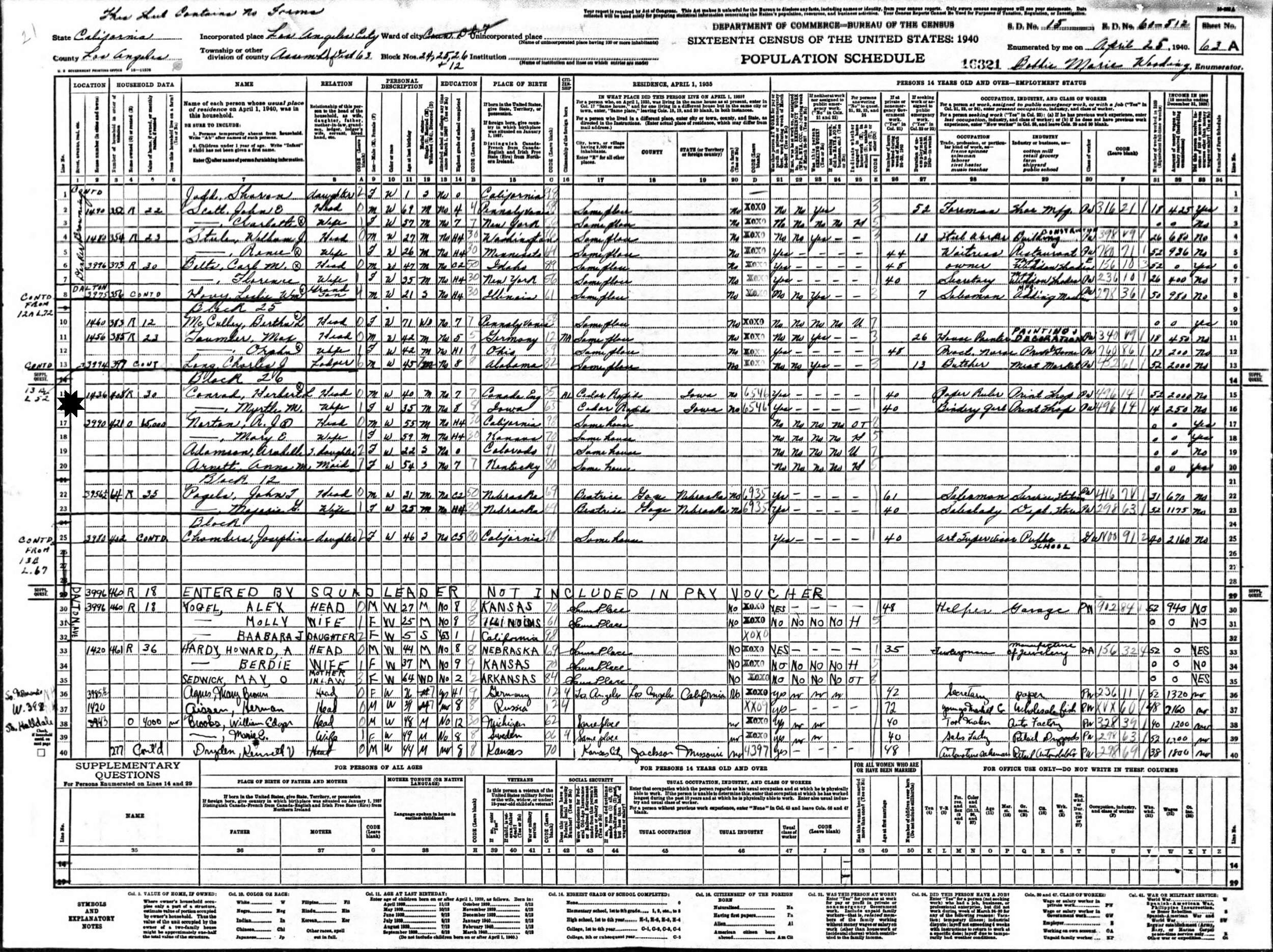 April 25, 1940 - Assembly District 63, Supervisor's District 15, Enumeration District 61-512, Los Angeles, Los Angeles County, California.