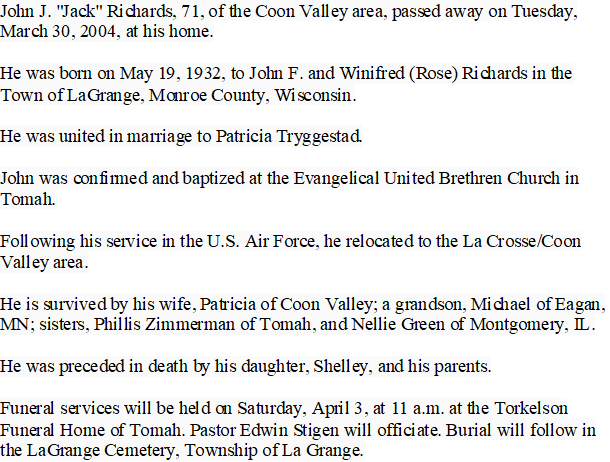 Died: March 30, 2004 in Coon Valley, Vernon County, Wisconsin.