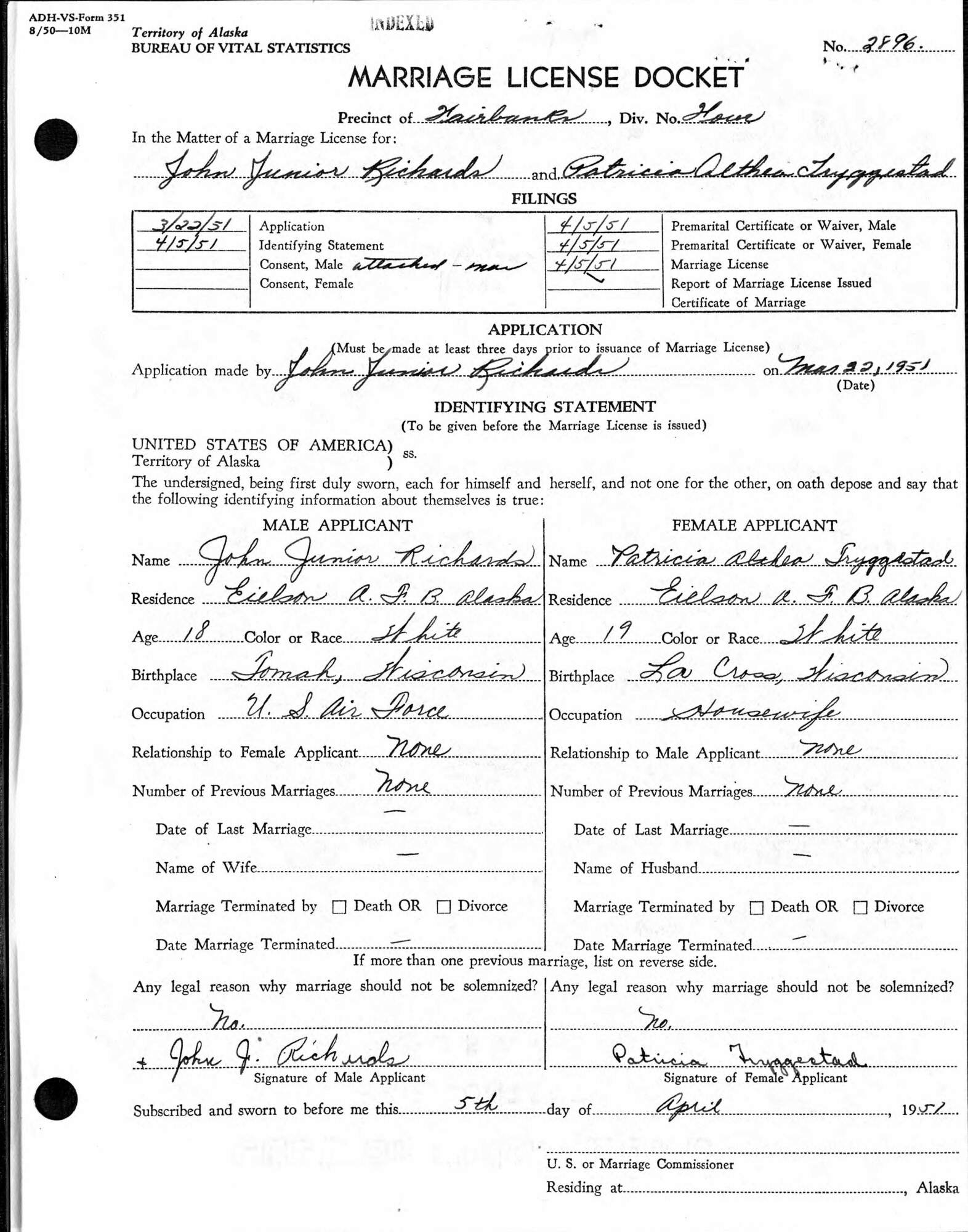 Married: Patricia Tryggestad 1951 in Alaska. (Marriage License: April 5, 1951-Fairbanks, Alaska; #2896