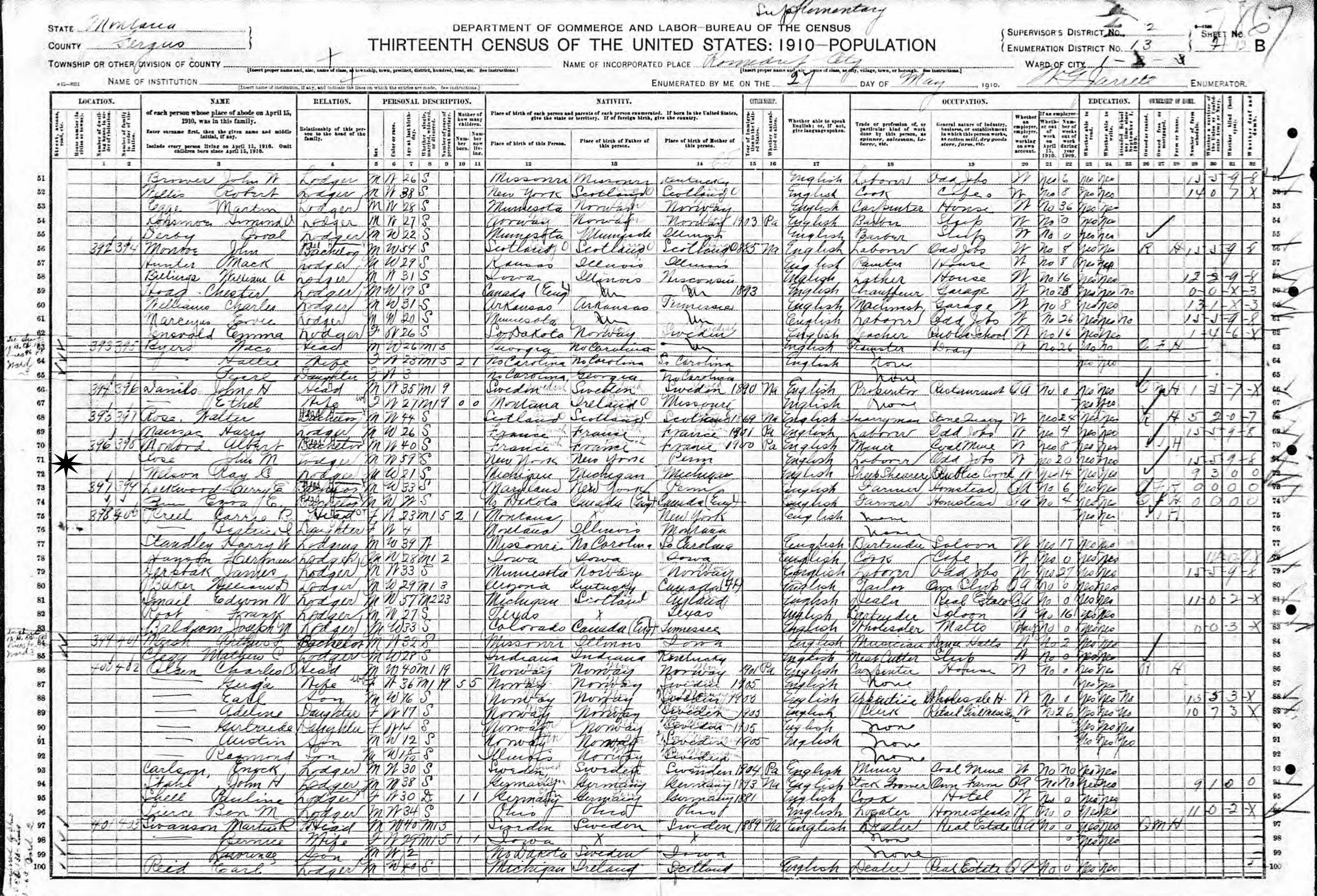 May 27, 1910 - Ward 1, Supervisor's District 2, Enumeration District 1, Roundup School District, Fergus County, Montana (Lodger).