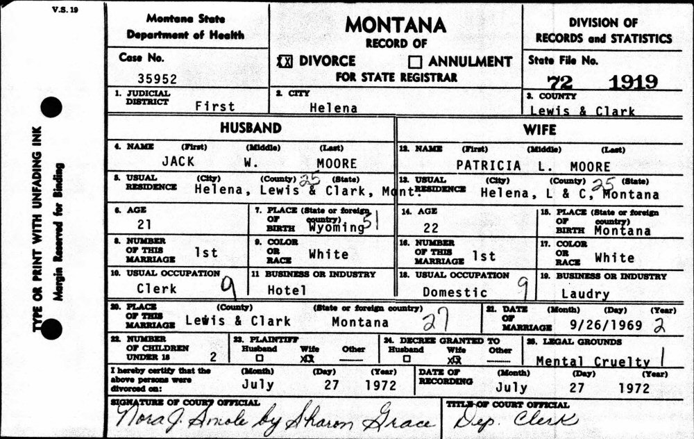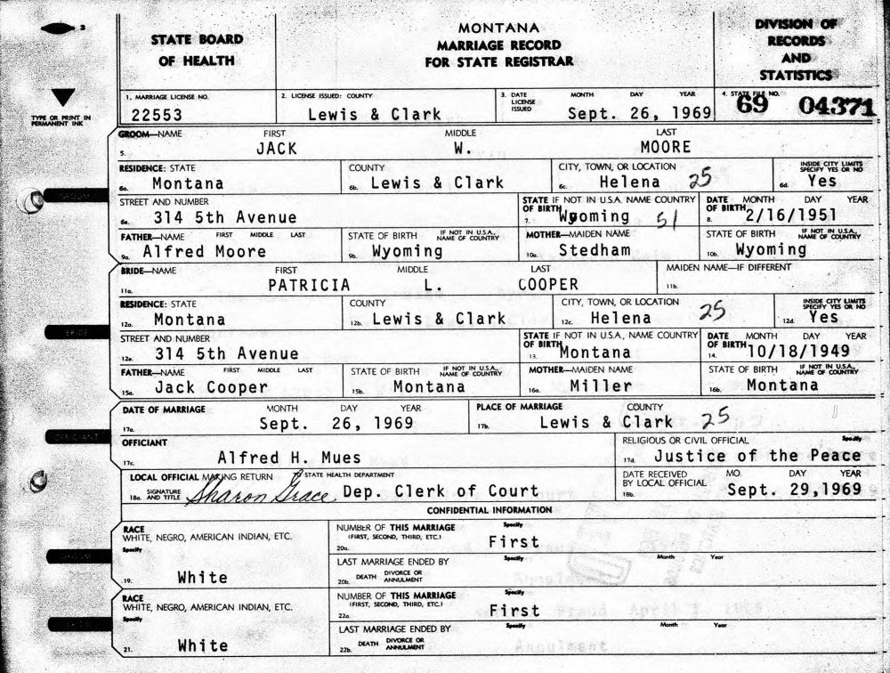 Married: (1) Patricia L Cooper September 29, 1969 in Helena, Lewis and Clark County, Montana. (Marriage License: September 26, 1969, #22553. Marriage Certificate: #69 04371.)