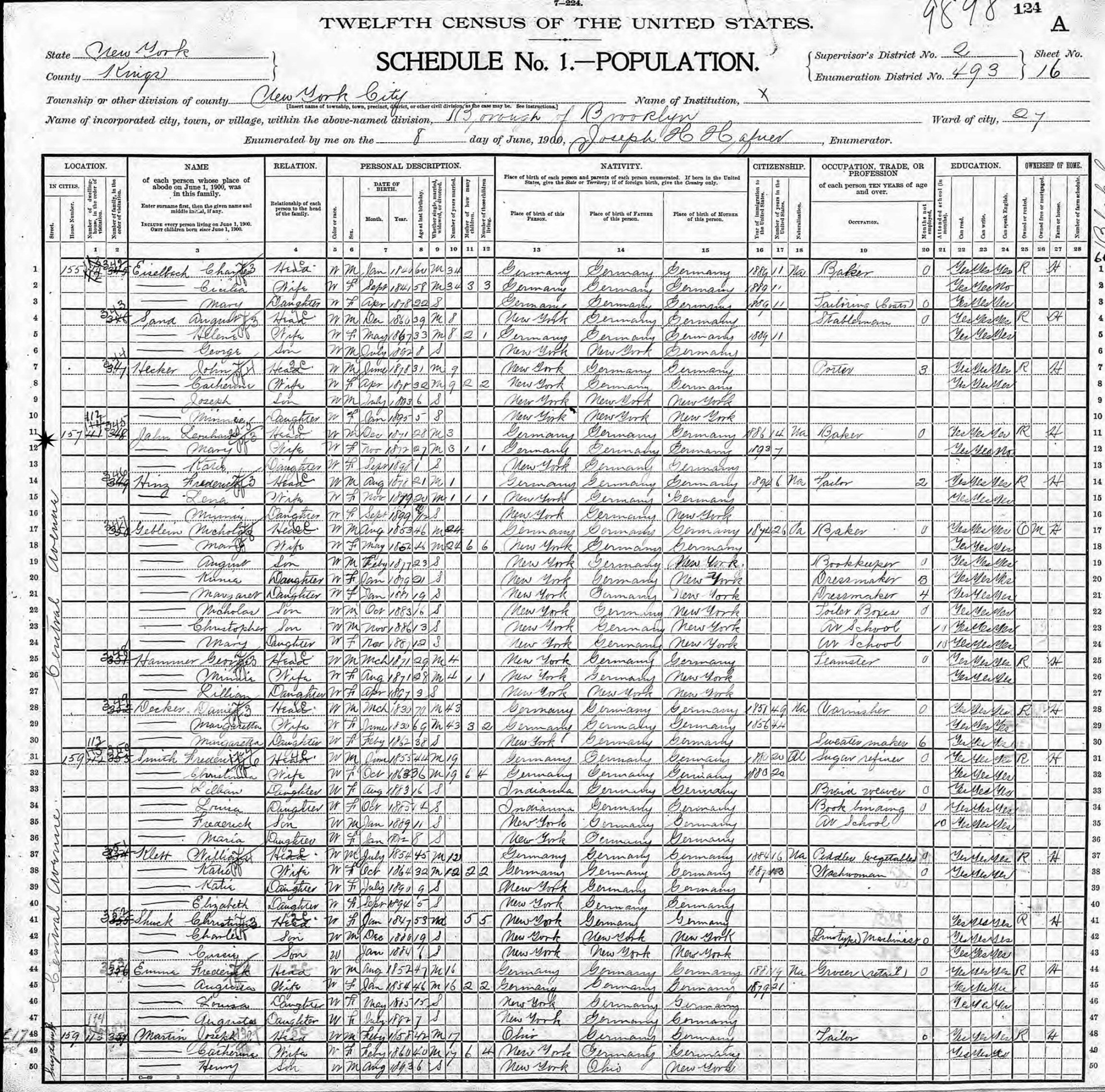 June 8, 1900 - 157 Central Avenue, Ward 27, Supervisor's District 2, Enumeration District 493, Brooklyn, Kings County, New York.