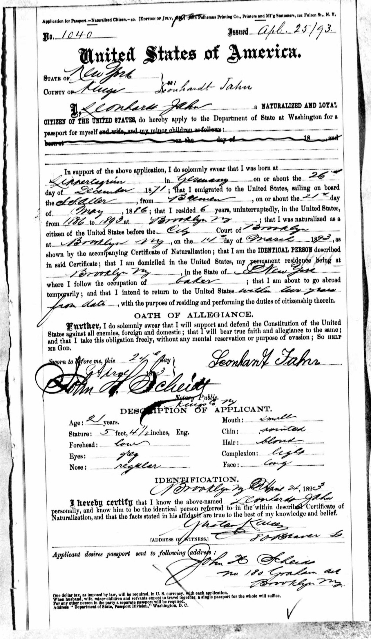 Naturalization: March 14, 1893 in City County, Brooklyn, Kings County, New York.
