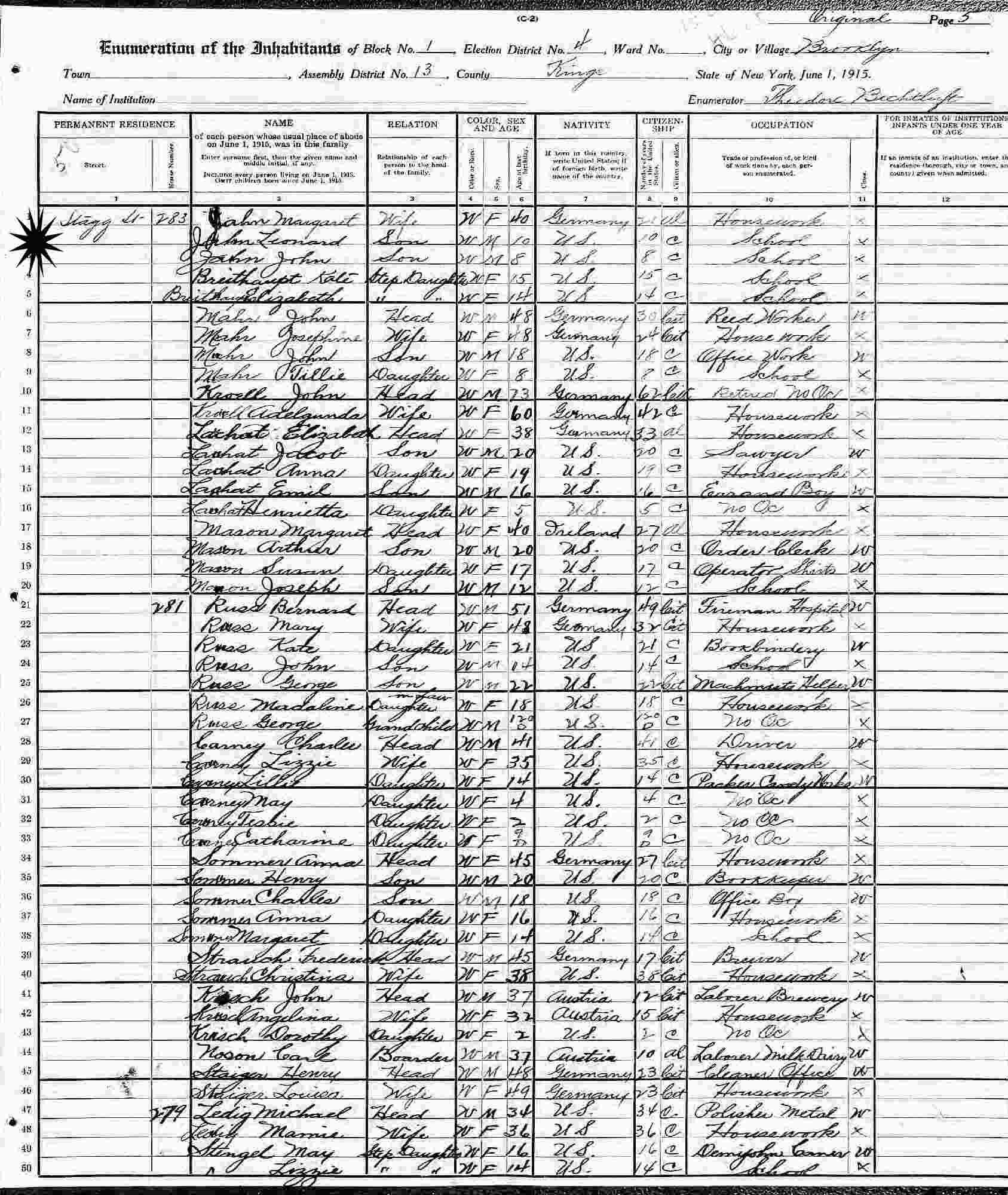 June 1, 1915 - New York State - 283 Stagg Street, Block 1, Assembly District 13, Election District 4, Brooklyn, Kings County, New York.