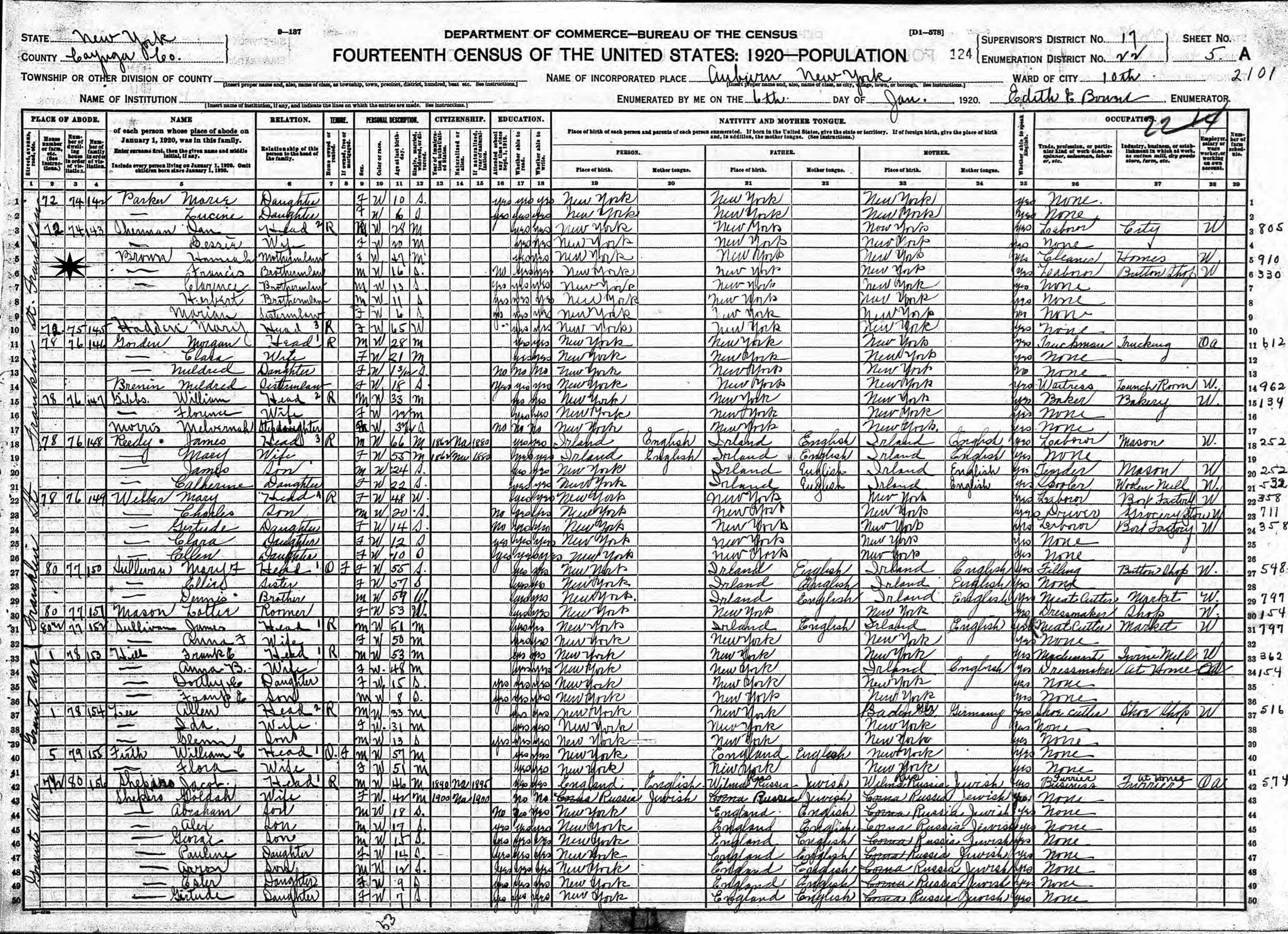 January 6, 1920 - 72 Franklin Street, Ward 10, Supervisor's District 17, Enumeration District 22, Auburn, Cayuga County, New York (w/sister and brother-in-law)
