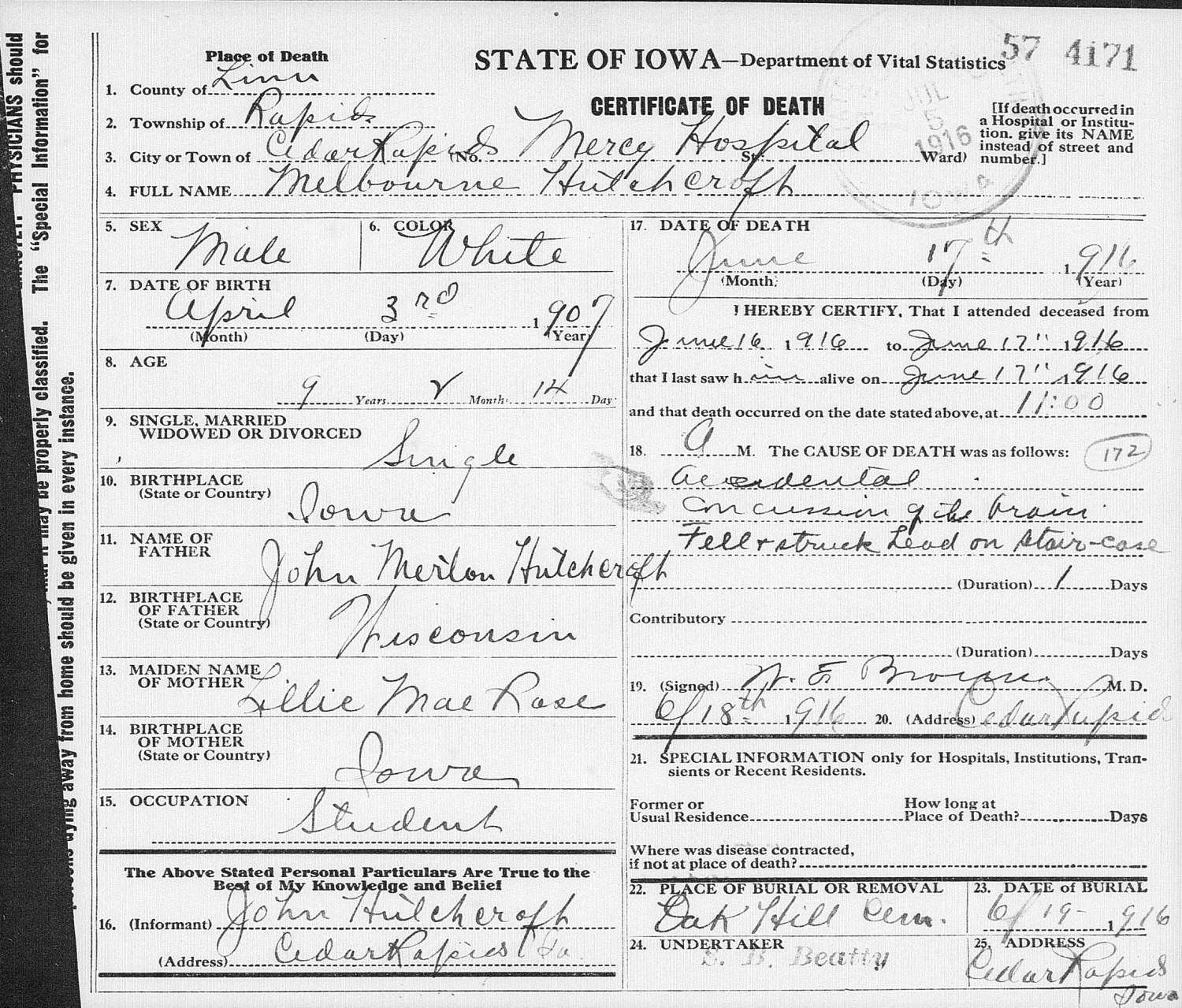 Buried: June 19, 1916 in Oak Hill Cemetery, Cedar Rapids, Linn County, Iowa.