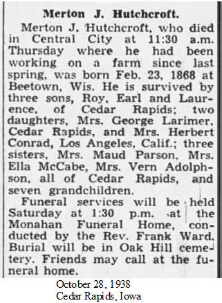 Died: October 27, 1938 in Maine Township, Central City, Linn County, Iowa. (Death Certificate: #57185.)