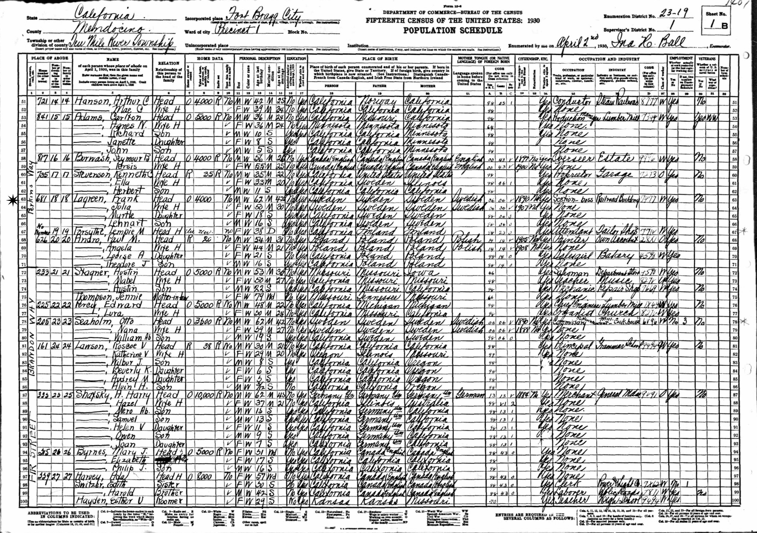 April 2, 1930 - 681 Perkins Way, Precinct 1, Supervisor's District 1, Enumeration District 23-19, Ten Mile River Township, Fort Bragg City, Mendocino County, California.