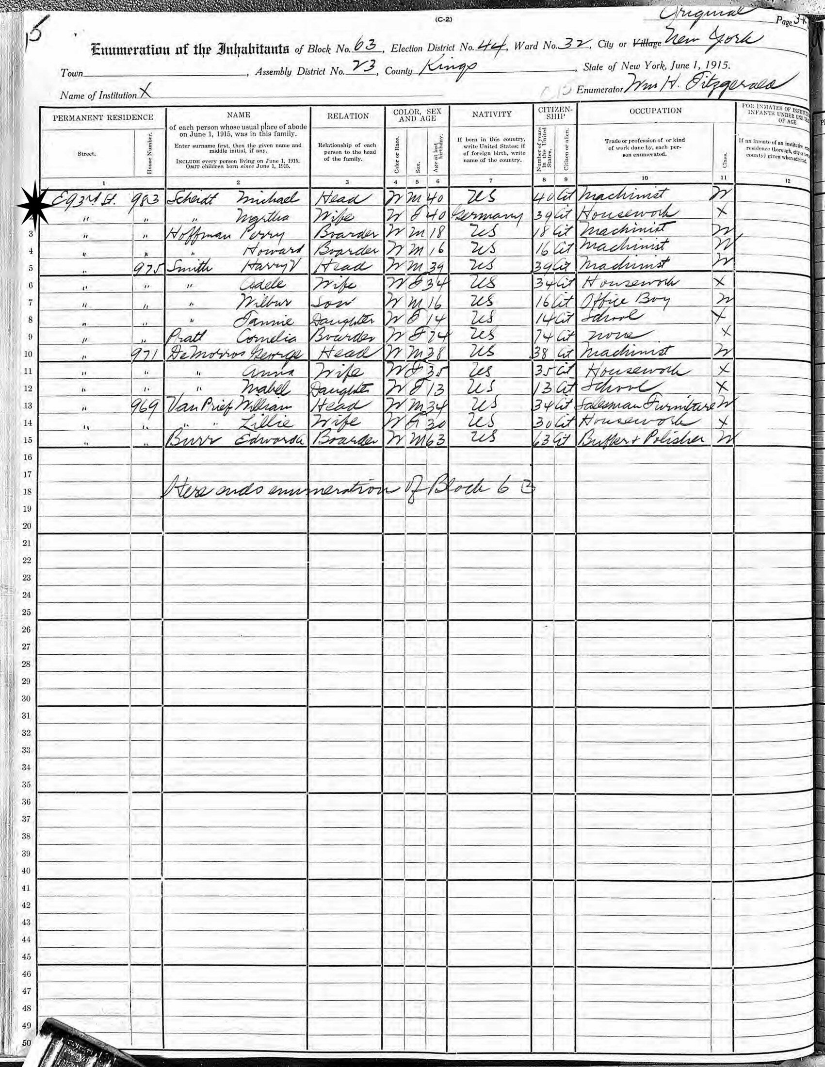 June 1, 1915 - New York State - 983 E 93rd Street, Assembly District 23, Election District 44, Ward 332, Block 63, Brooklyn, Kings County, New York.