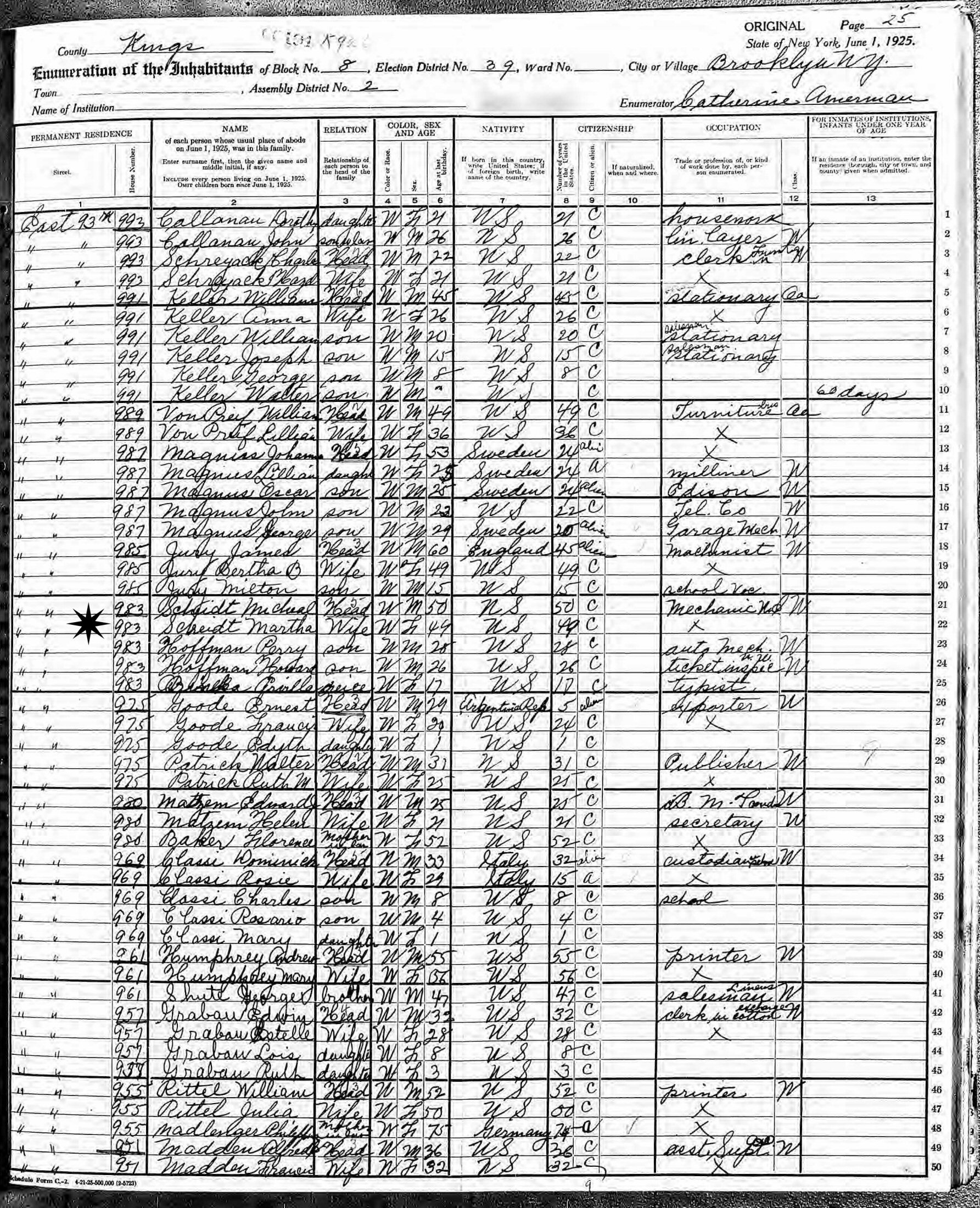 June 1, 1925 - New York State - 983 E 93rd Street, Election District 39, Assembly District 2, Block 8, Brooklyn, Kings County, New York.