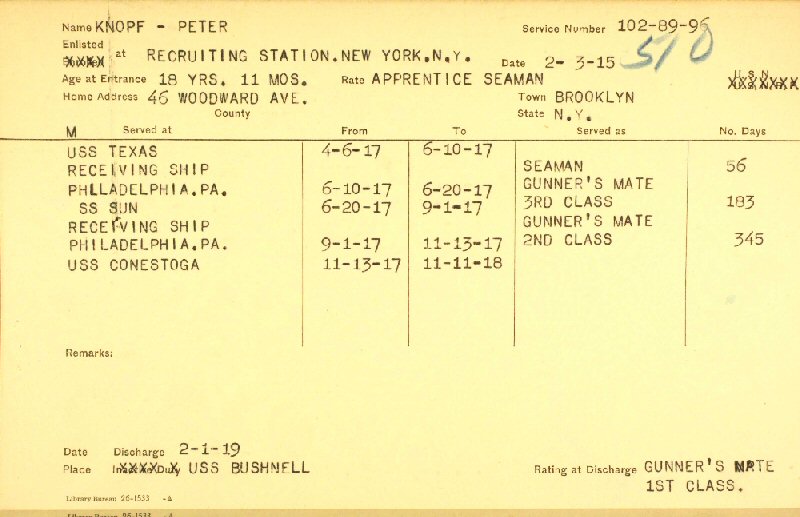 Military Service: Bet. February 03, 1915 - January 31, 1919 - WWI - GM/1C US Navy.