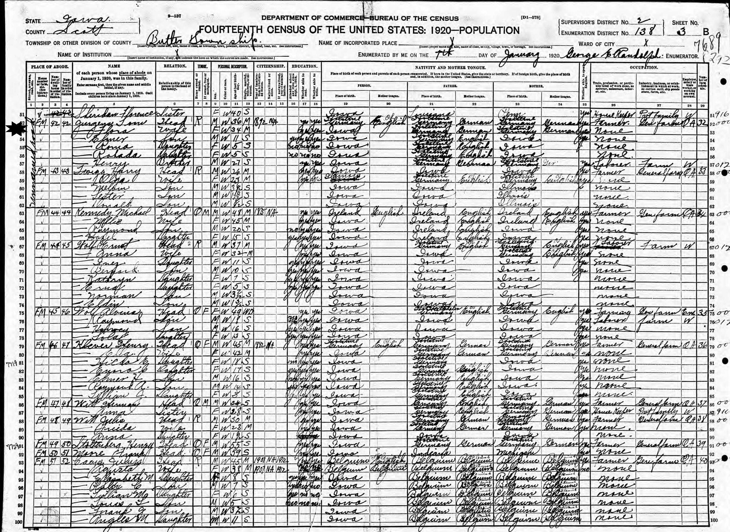 January 7, 1920 - Farm on Unnamed Road, Supervisor's District 2, Enumeration District 138, Butler Township, Scott County, Iowa.