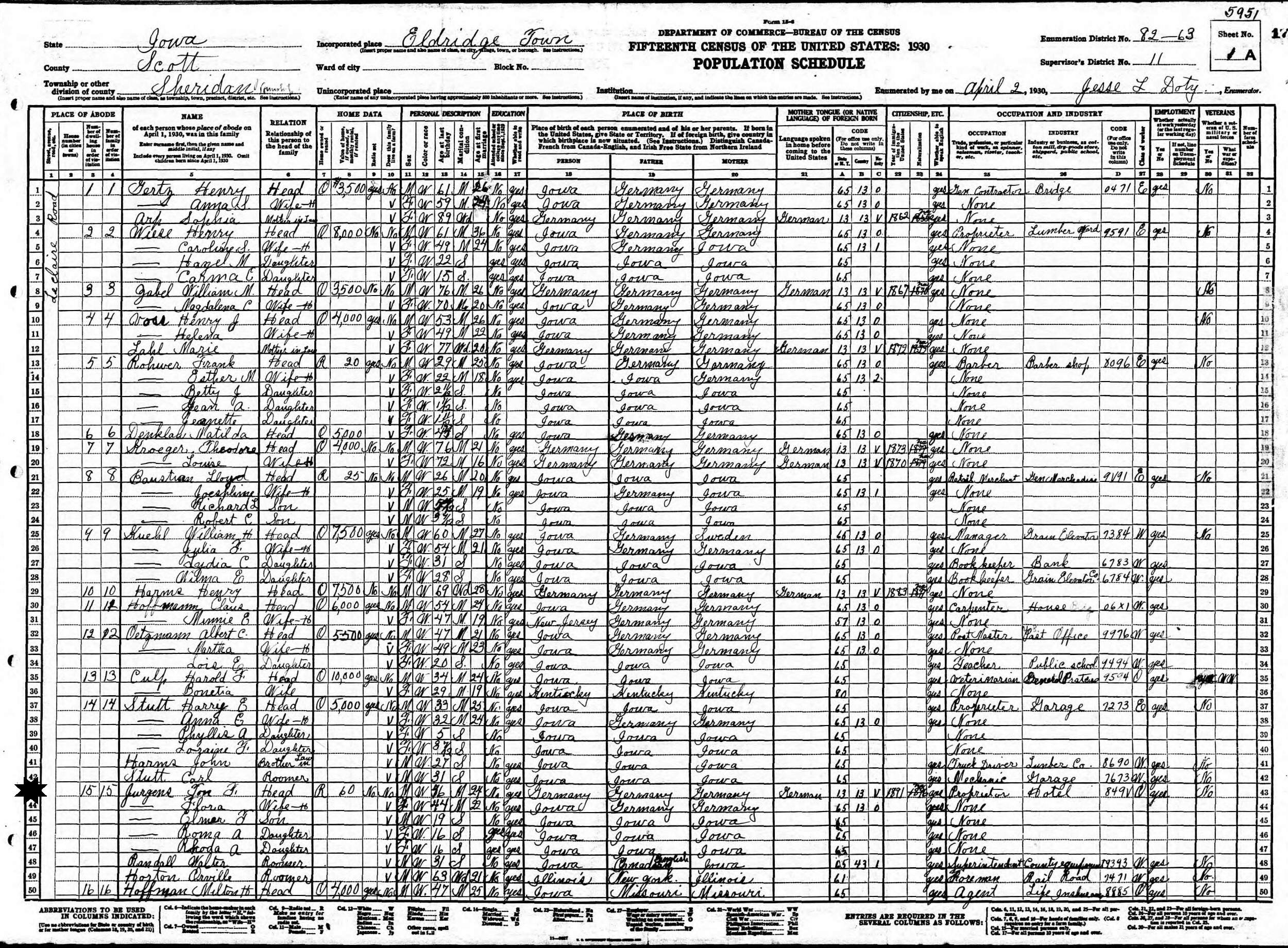 April 2, 1930 - Leclaire Road, Supervisor's District 11, Enumeration District 82-63, Eldridge Town, Sheridan, Scott County, Iowa.