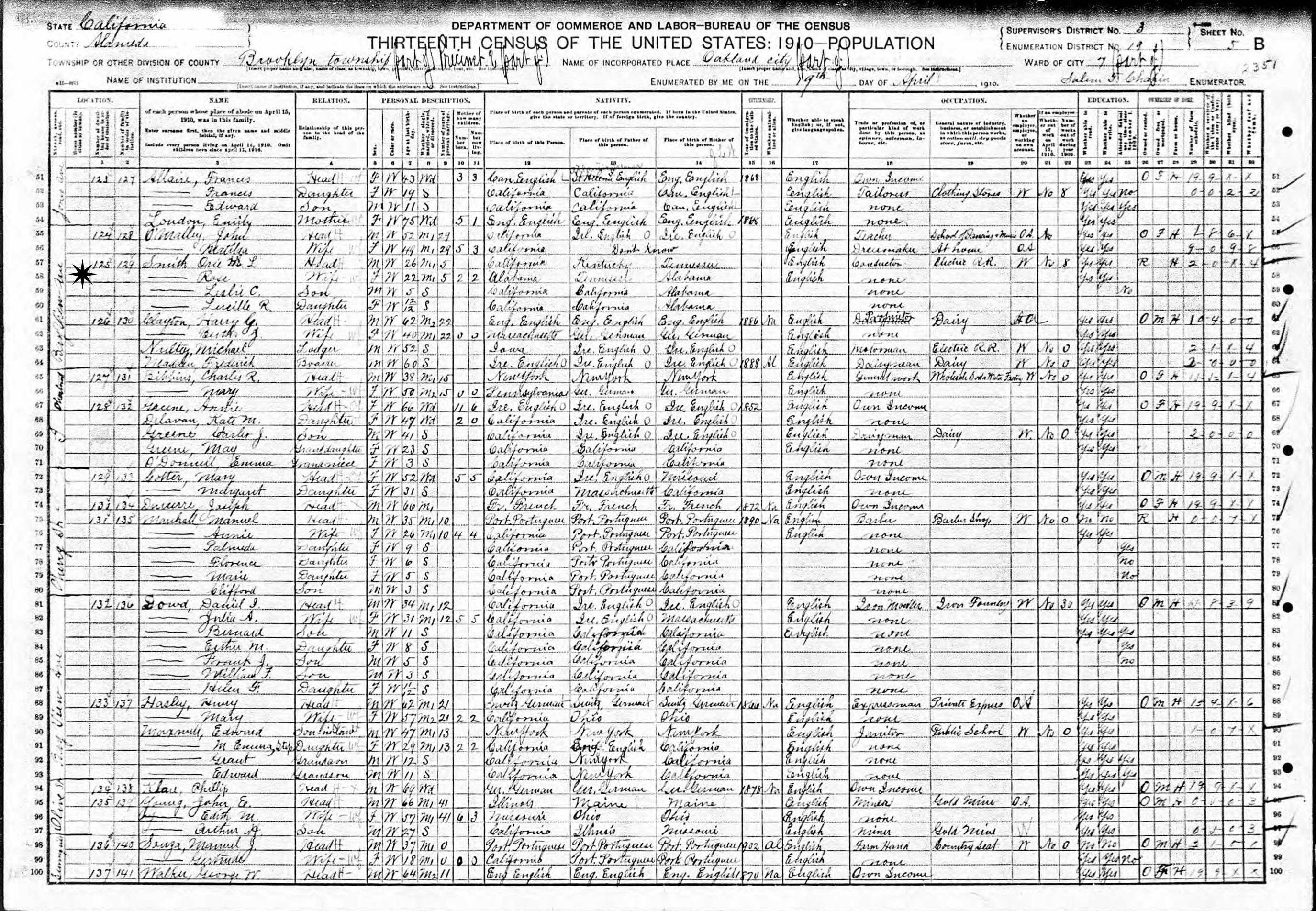 April 19, 1910 - Bay View Avenue, Precinct 2, Ward 7, Supervisor's District 3, Enumeration District 19, Brooklyn Township, Pakland City, Alameda County, California.