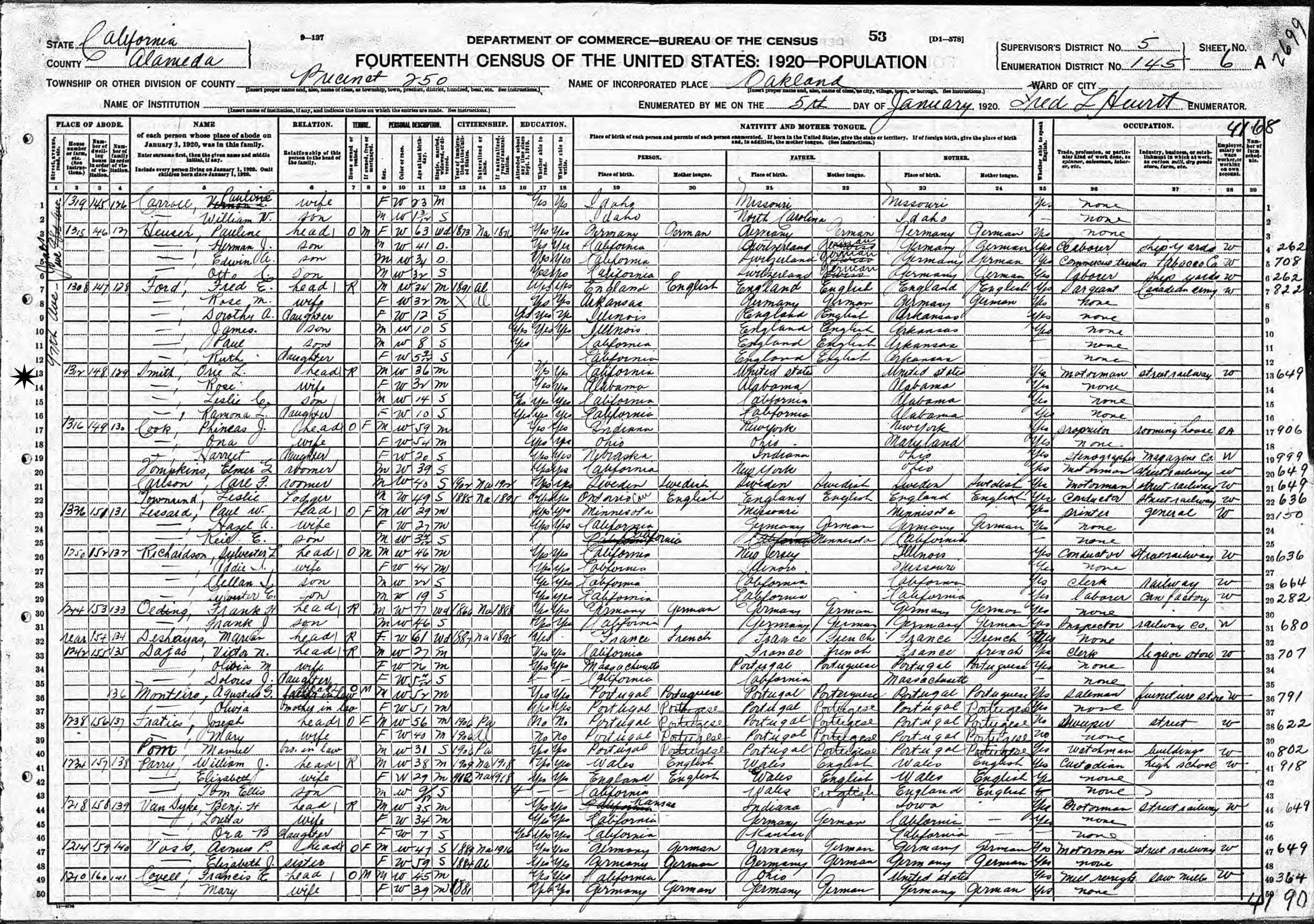 January 5, 1920 - 1312 97th Avenue, Precinct 250, Supervisor's District 5, Enumeration District 145, Oakland, Alameda County, California.