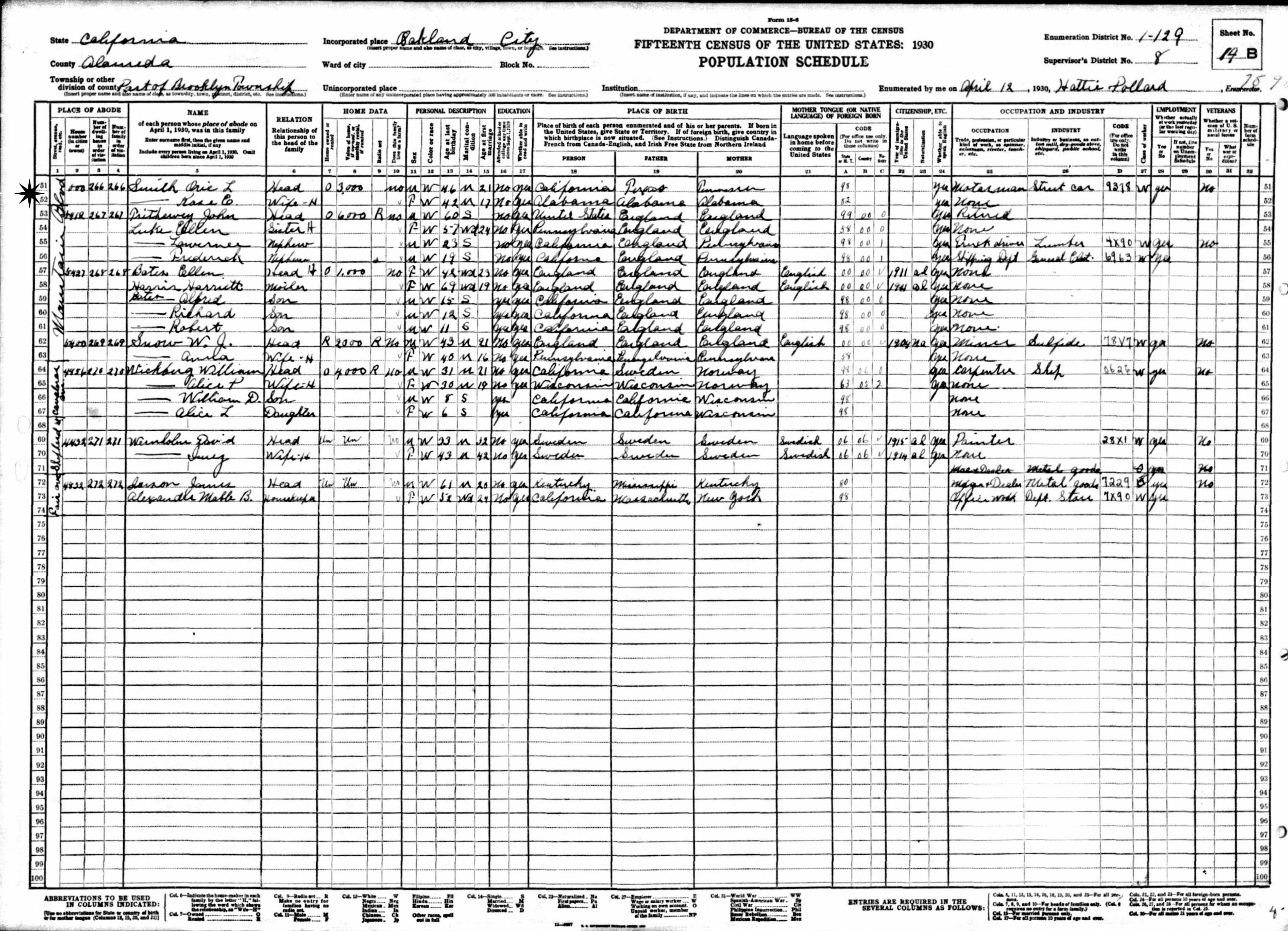 April 12, 1930 - 5912 Mountain Blvd, Supervisor's District 8, Enumeration District 1-129, Brooklyn, Township, Oakland City, Alameda County, California.