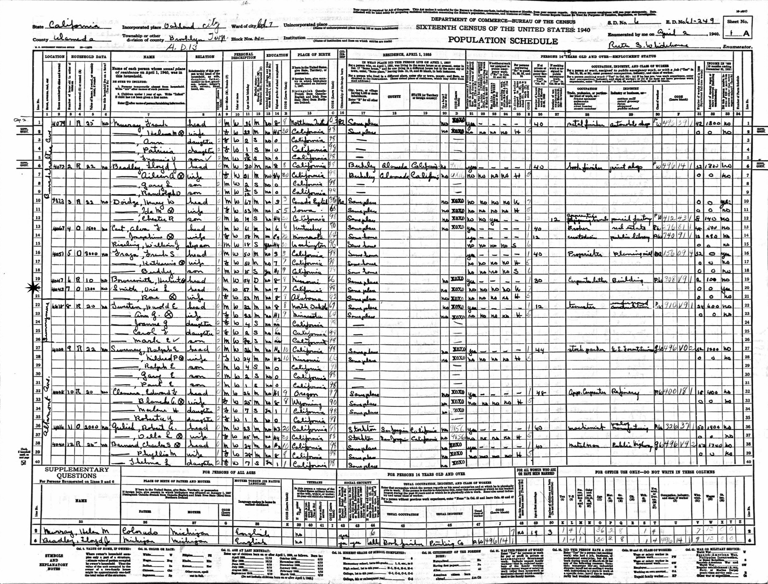April 2, 1940 - 4043 Burkhalter Avenue, Assembly District 13, Ward 7, Block 14, Supervisor's District 6, Enumeration District 61-249, Brooklyn Township, Oakland, Alameda County, California.