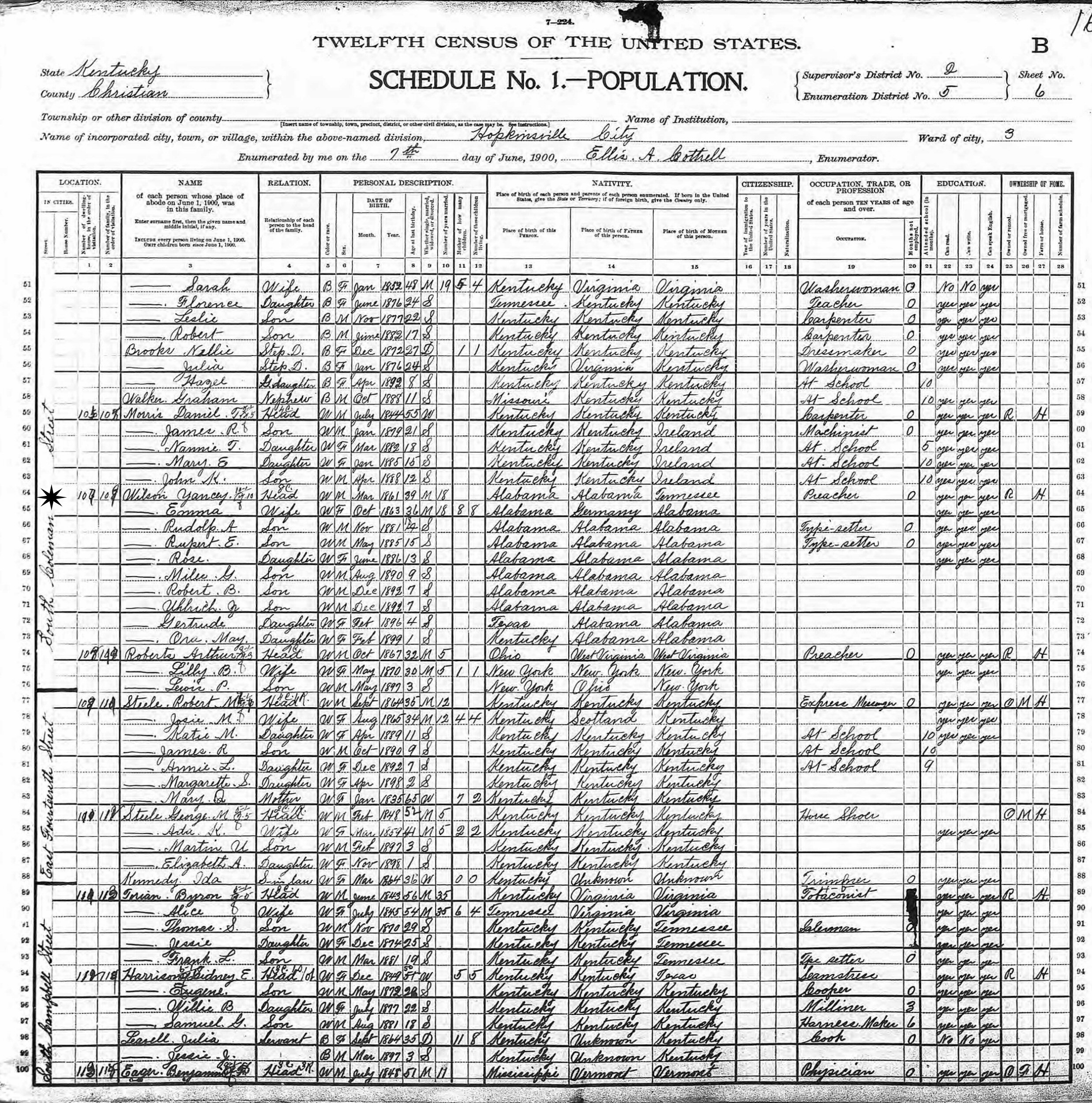 June 7, 1900 - South Coleman Street, Ward 3, Supervisor's District 2, Enumeration District 5, Hopkinsville City, Christian County, Kentucky.