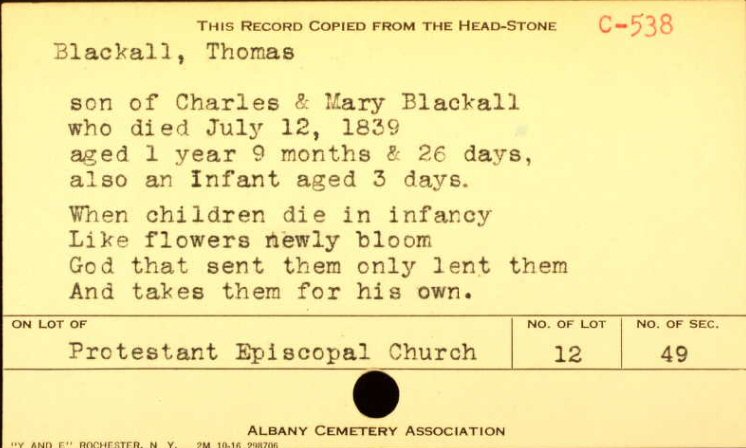 Following a resolution in 1866 by the Albany Common Council, many remains were disinterred and moved to Albany Rural Cemetery for reburial. A list of the inscriptions was created, divided by church group. This person was named in the St. Peter's Episcopal Church section of that list.