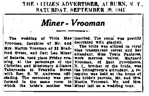 Married: Carl Leo Miner September 19, 1941 in Christian and Missional Alliance Tabernacle, Auburn, Cayuga County, New York.