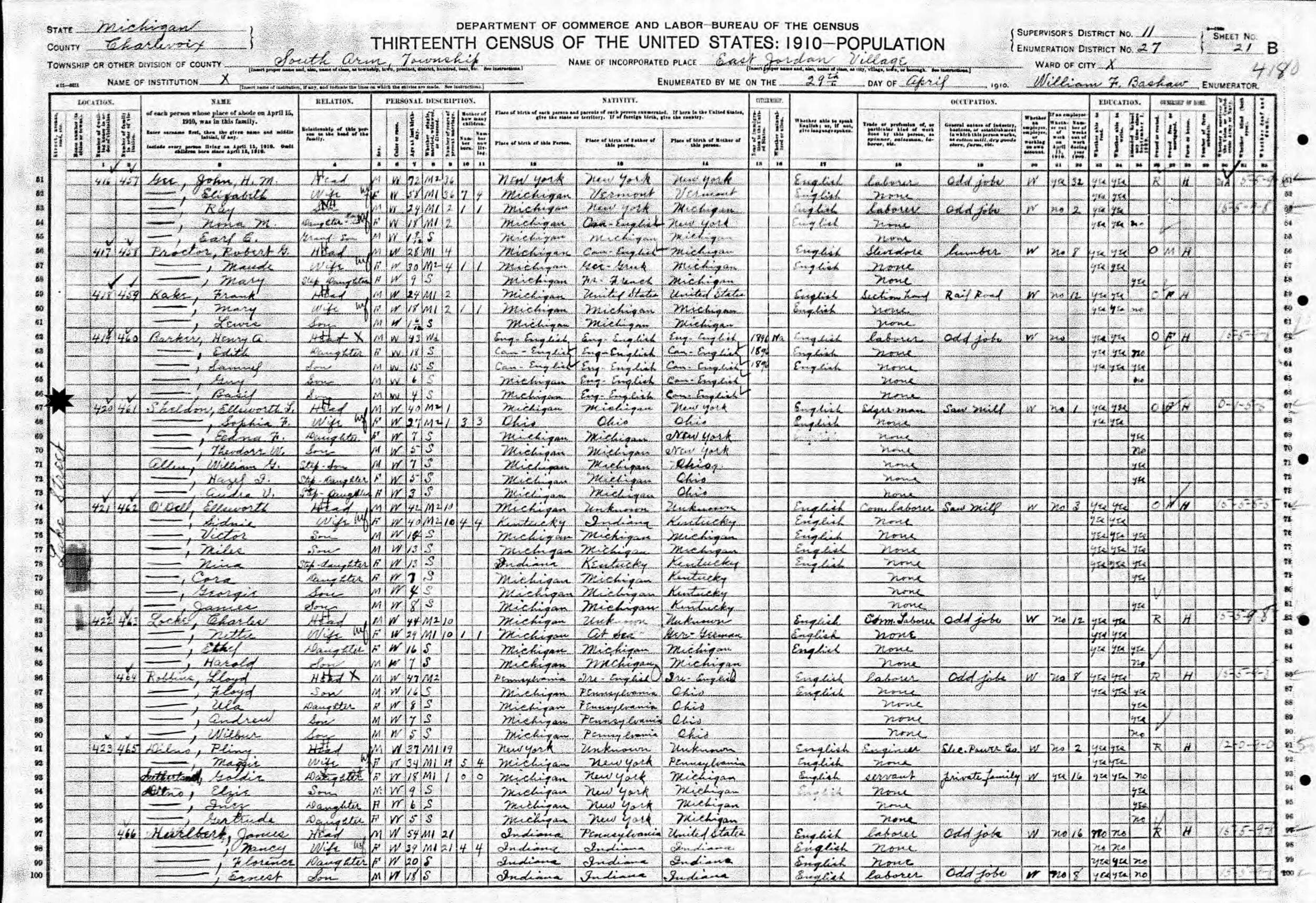 April 29, 1910 - Lake Street, Supervisor's District 11, Enumeration District 27, East Jordan Village, South Arm Township, Charlevoix County, Michigan.
