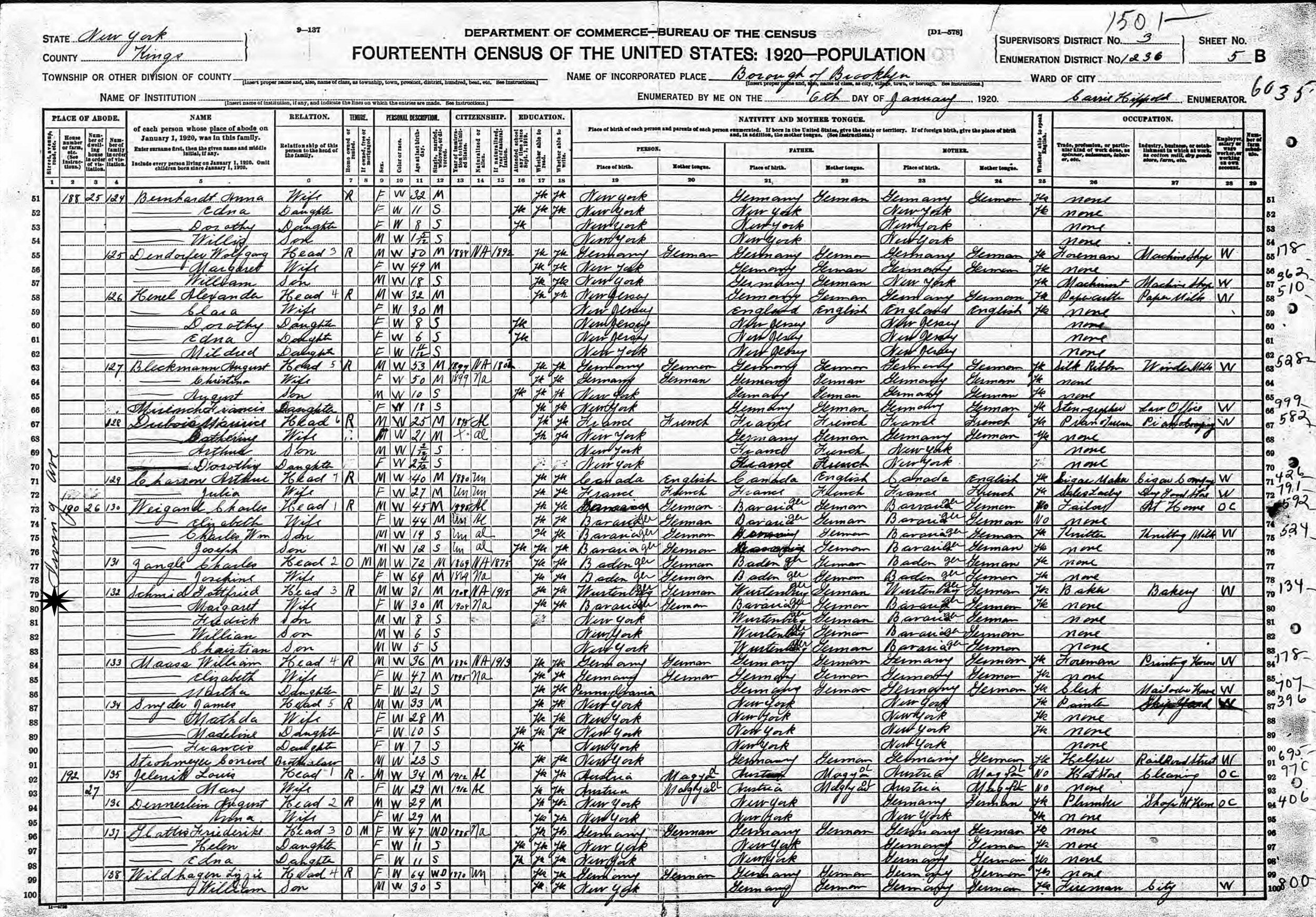 January 6, 1920 - 190 Irving Avenue, Supervisor's District 3, Enumeration District 1236, Brooklyn, Kings County, New York.