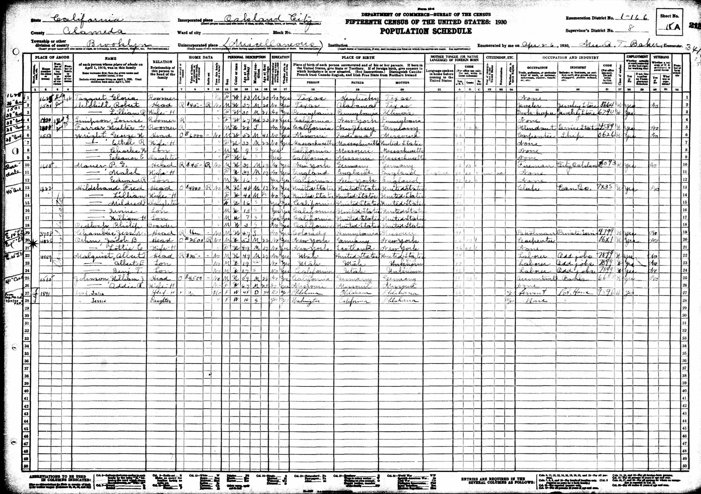 April 26, 1930 - 4026 East 15th Street, Supervisor's District 8, Enumeration District 1-166, Brooklyn Township, Oakland City, Alameda County, California.