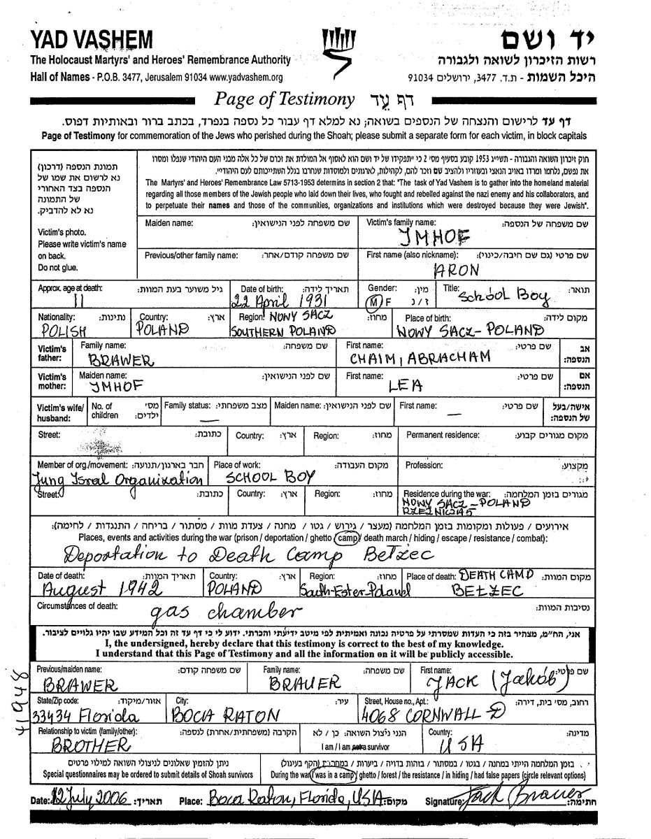 Aron Brawer was born in Nowy Sacz, Poland, 1931 to Chaim Abracham and Lea nee Imhof. He was child. Prior to WWII he lived in unstated place. During the war he was in Nowy Sacz, Poland.