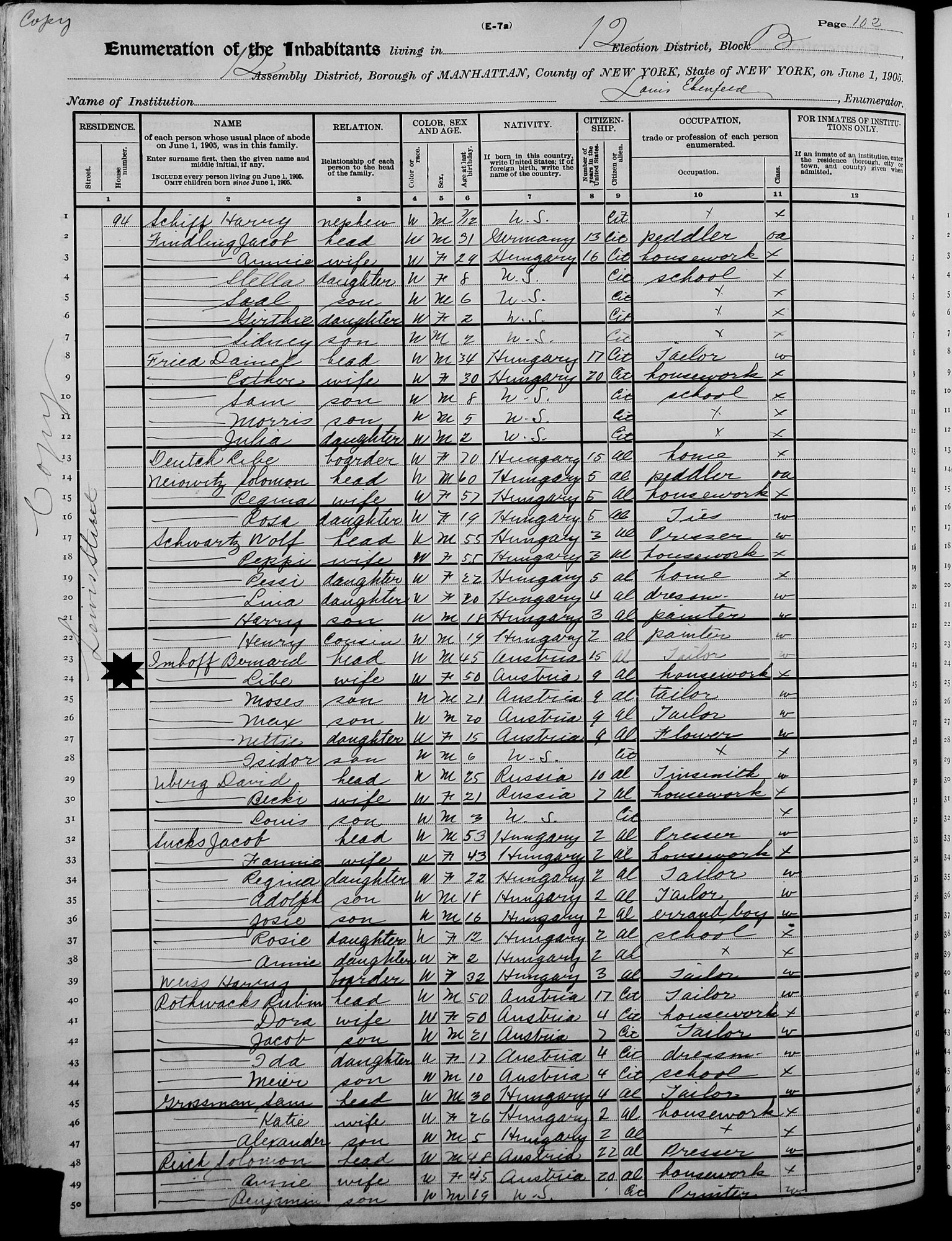 June 1, 1905 - New York State - 94 Lewis Street, Assembly District 12, Election District 12, Block B, Manhattan, New York, New York.