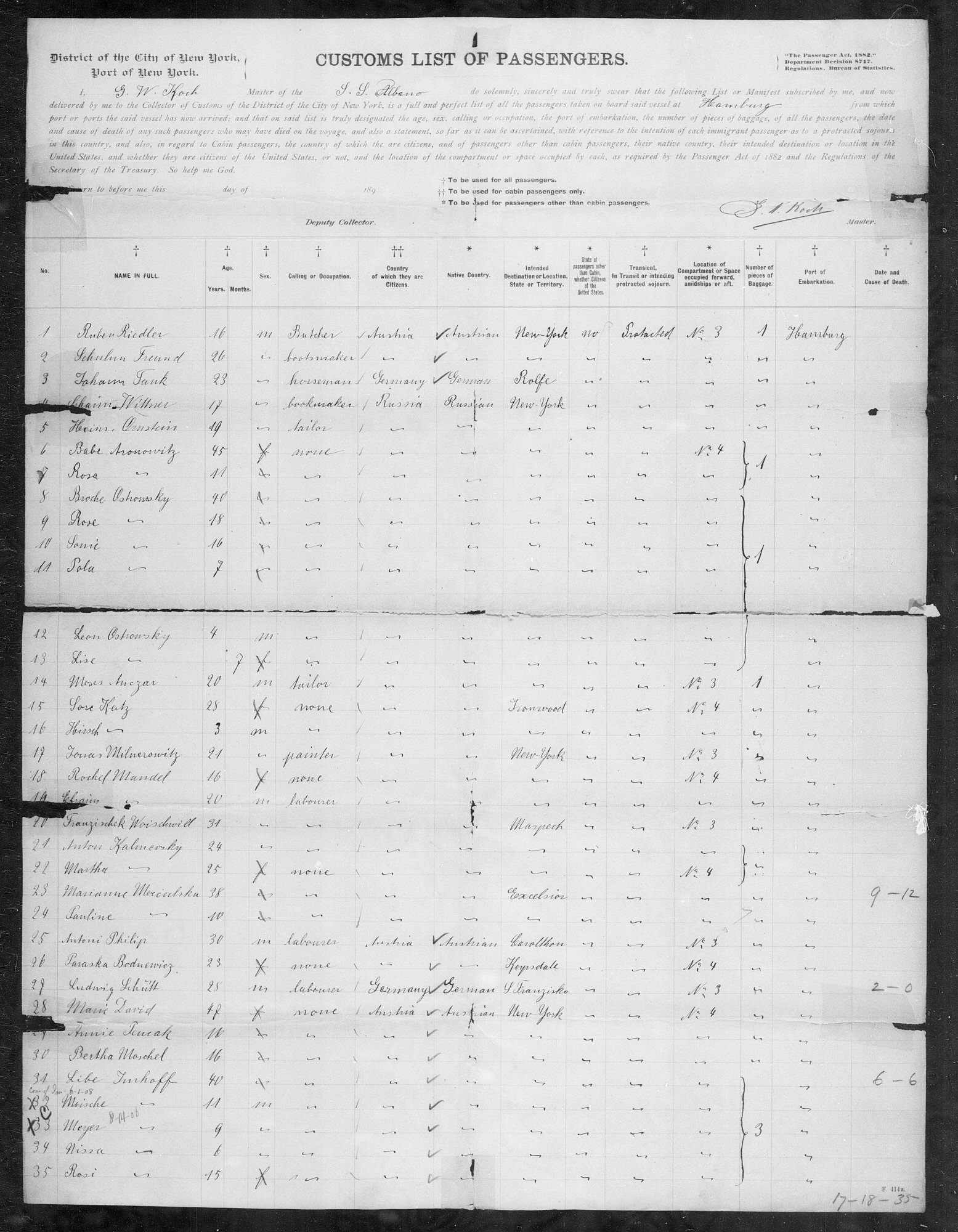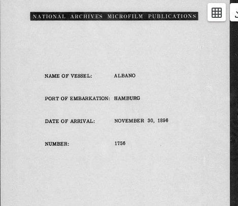 November 30, 1896 - Hamburg, Germany to New York City, New York (Ellis Island) Ship: Albano.